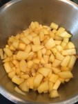 - Pour la garniture faites fondre du sucre en poudre à feu doux. Lorsque le caramel est prêt ajoutez une noisette de beurre et les pommes prédécoupées en petits dés. Laissez cuire jusqu’à obtenir une pomme légèrement fondante. Réservez au frais.