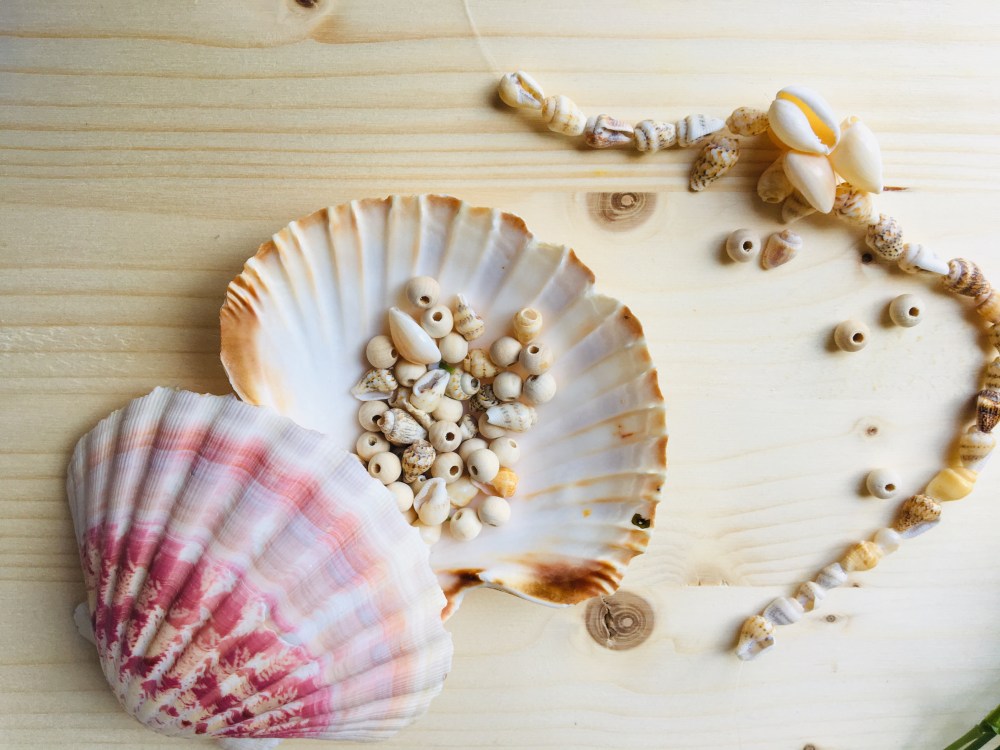 J’ai utilisé des petites perles de bois, des coquillages d’un vieux collier qui trainait depuis des années dans la maison. Les fleurs sont bien sûr artificielles, vous pouvez en récupérer dans votre entourage ou acheter un petit bouquet.