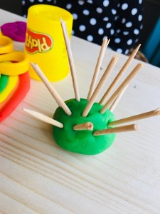 Créer des hérissons :Une boule et hop, on plante des cure dents dedans. Ma fille passe du temps à les mettre, les ôter, faire marcher le hérisson.
