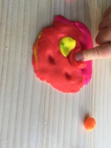 4. Faire une pizza : faites lui faire des petits trous qu’il devra ensuite combler avec des petites boules. Ma fille s’amuse à les enfoncer.