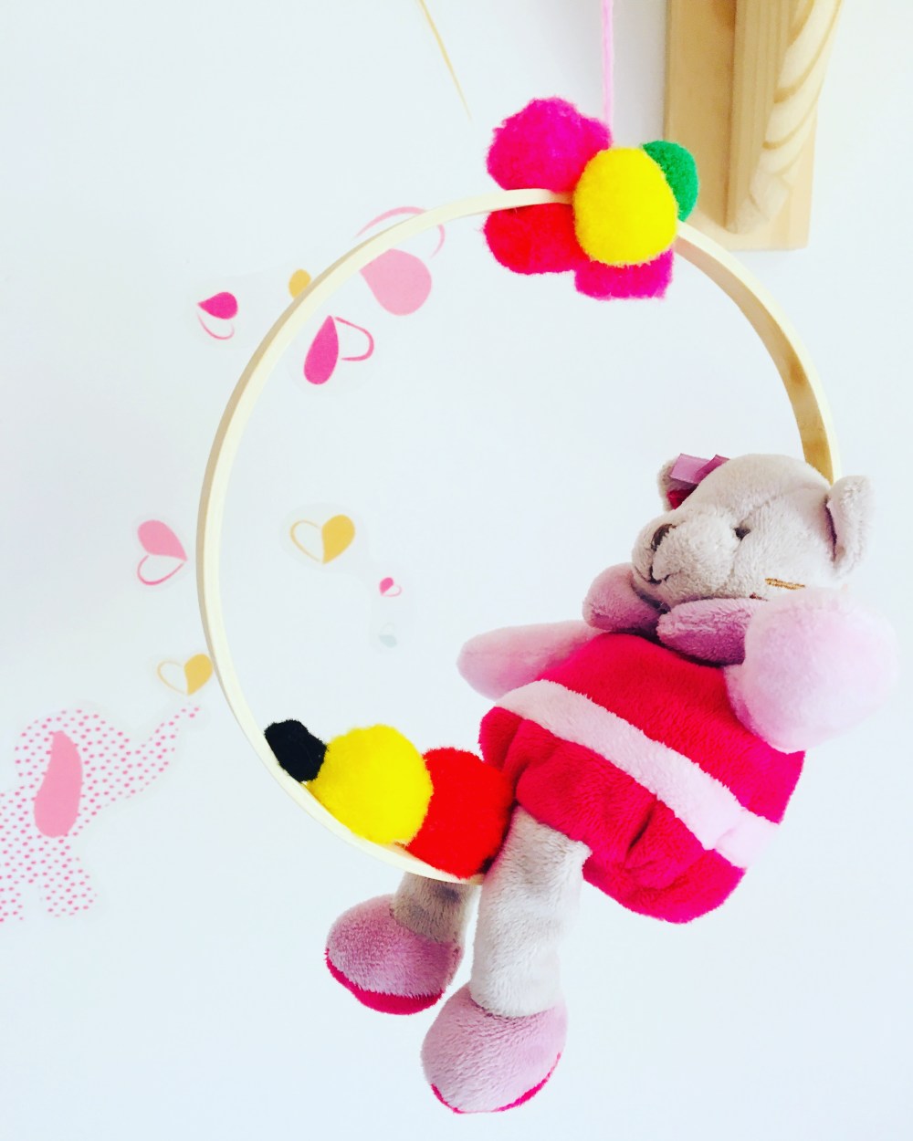 - Pour réaliser un petit mobile avec de la récup’, il suffit d’utiliser une petite peluche que vous avez. Échantillon offert avec la liste de naissance, peluche de porte clef, mini doudou… un anneau d’attrape rêve en bois pour le tour, de la taille que vous souhaitez.