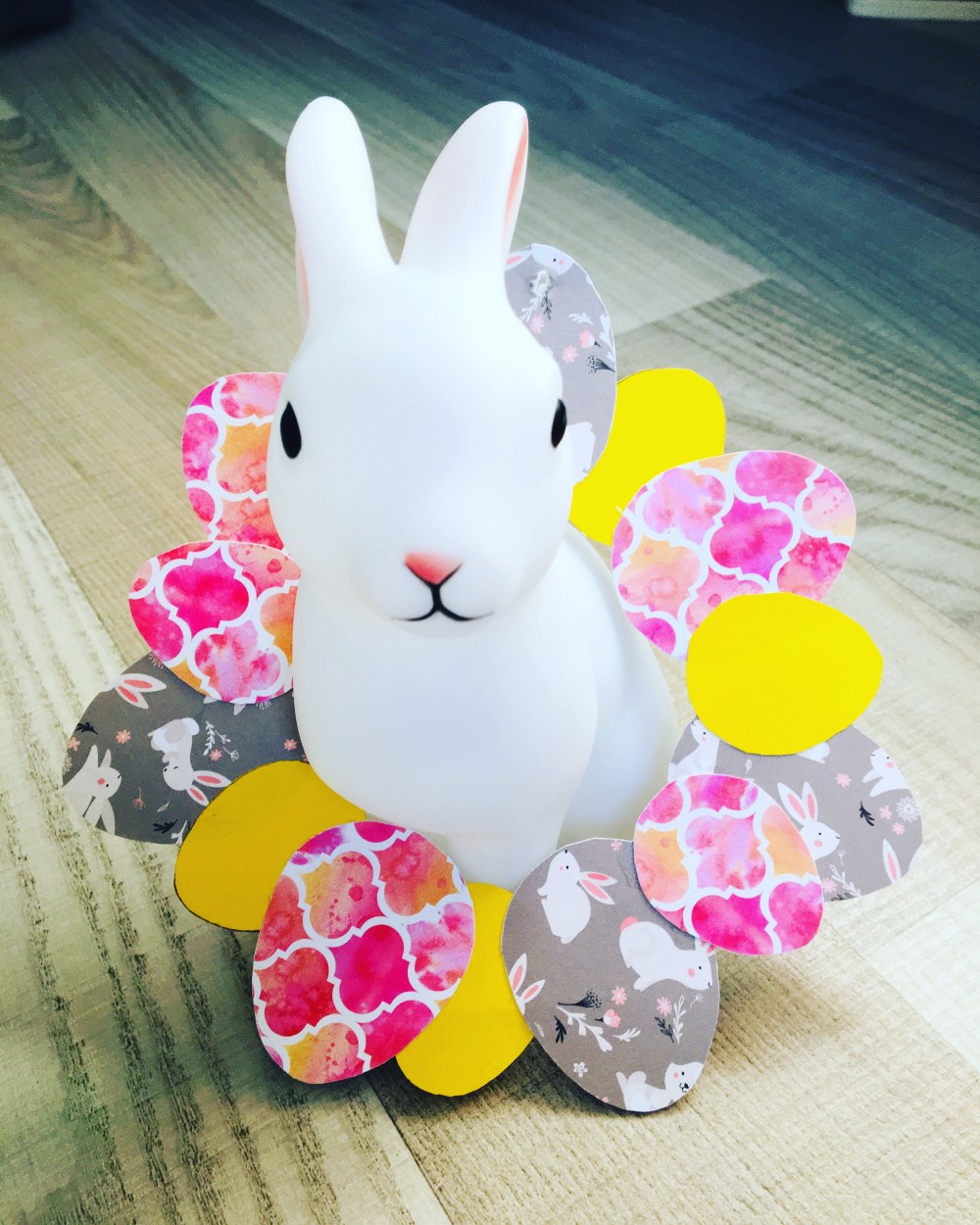 Pour cette couronne rien de plus simple, il suffit de découper deux formes d’œufs. Une grosse, une petite et alterner en collant pour former un cercle. Percez un petit trou dans un des œufs si vous souhaitez suspendre la couronne. Faites ou imprimez deux patrons d’œufs de manière à avoir ensuite une couronne régulière.