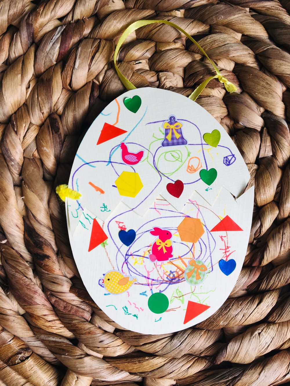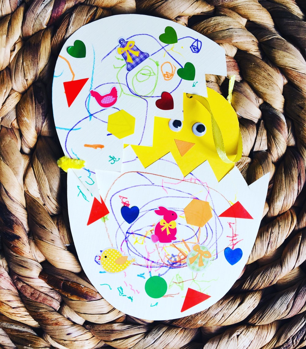 L’œuf et son petit poussin. Il suffit de découper un œuf et lui faire coller des gommettes et dessiner. Le petit poussin est collé derrière et sur le côté le petit trou à la perforatrice.