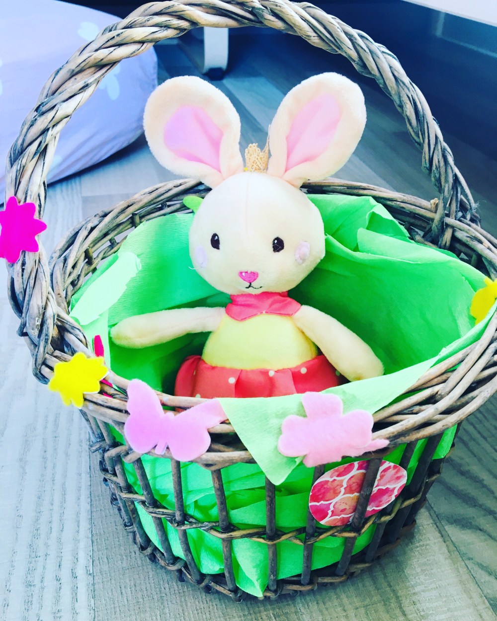 Pour cette activité j’ai récupéré un petit panier en osier que nous avons décoré avec des fleurs et des papillons découpés en feutrine. Nous les avons ensuite collés.