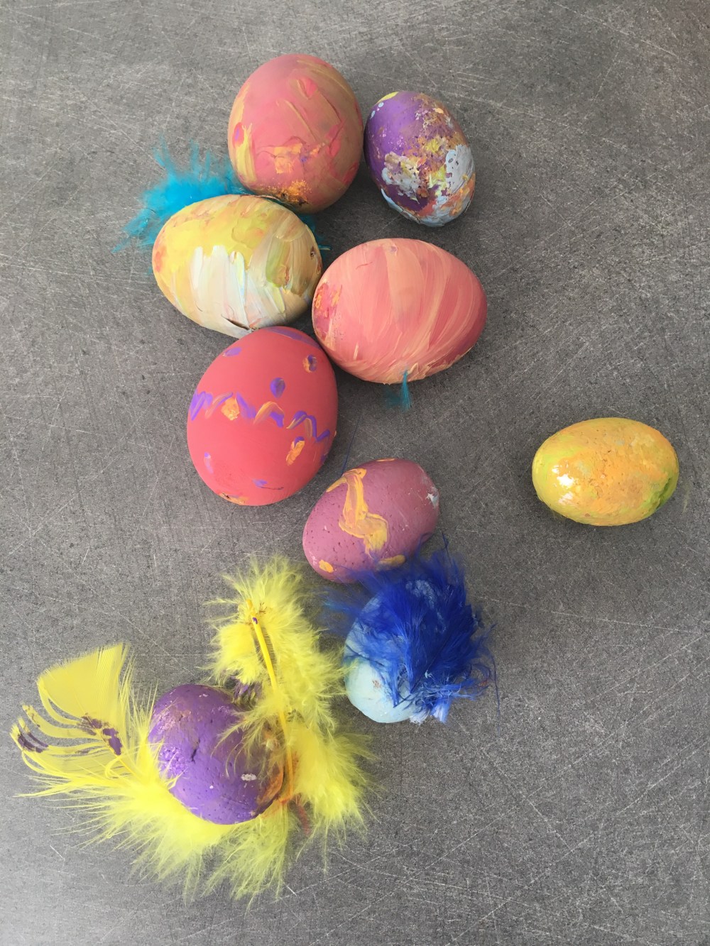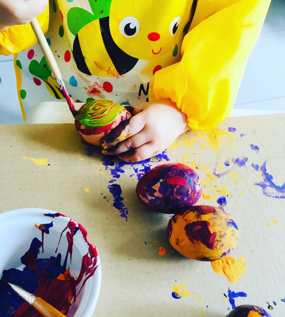 Pour les œufs de Pâques, prenez un œuf, un vrai. Percez un petit trou au dessus et en dessous avec une punaise puis soufflez fort dans un des trous. L’œuf va sortir par le trou du bas. Récupérez le pour faire une omelette ou des crêpes. Ensuite, munissez votre enfant d’un pinceau, de gouash et laissez le libre. Vous pouvez utilisez un bâtonnet de barbecue pour tenir l’œuf mais cela convient pour les plus grands. Comme ma fille a deux ans, elle était plus adroite de le tenir dans sa main, et bien sûr de s’en mettre partout 🙂