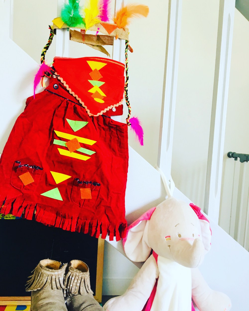 Pour les plumes sur la tête, j’ai fais deux tresses avec des fils de laine de couleurs et j’ai collé au pistolet à colle car je ne retrouvais pas mon agrafeuse 🙂