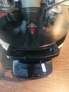 Vous pouvez ensuite faire chauffer vos gaufres. Aujourd’hui on m’a prêté un appareil pour des mini gaufres. Adaptez le temps de cuisson en fonction de votre appareil. Bien huilé et chauffé auparavant.
