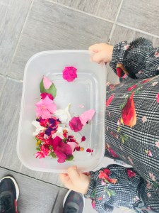 Tout d’abord nous sommes partis à la recherche de fleurs dans la rue et le jardin. Il en fallait de plusieurs couleurs et différentes tailles. Elle s’est bien pris au jeu.