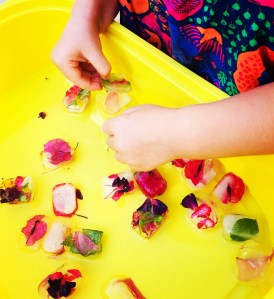 Elle y a ensuite versé de l’eau froide. Cette exercice a permis de travailler sa motricité fine et sa précision dans l’eau qu’elle versait. Nous avons ensuite mis les petits glaçons au congélateur.