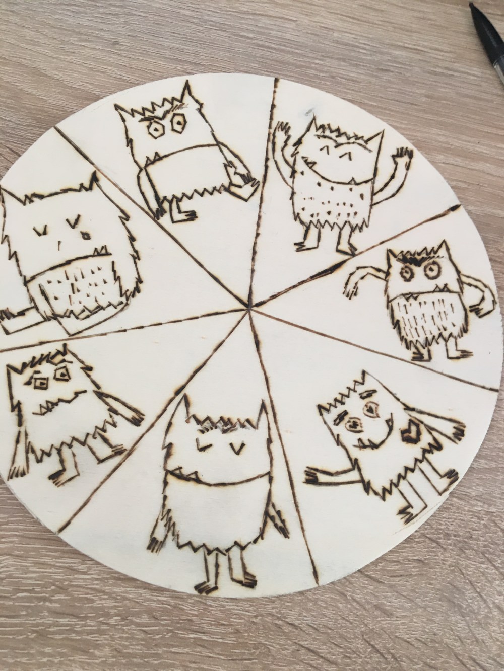 Pour réaliser cette roue, j’ai utilisé une planche de bois de palmier d’épaisseur 5mm. Ça se coupe au cuiter. Ensuite j’ai pyrogravé et peint les petits monstres.