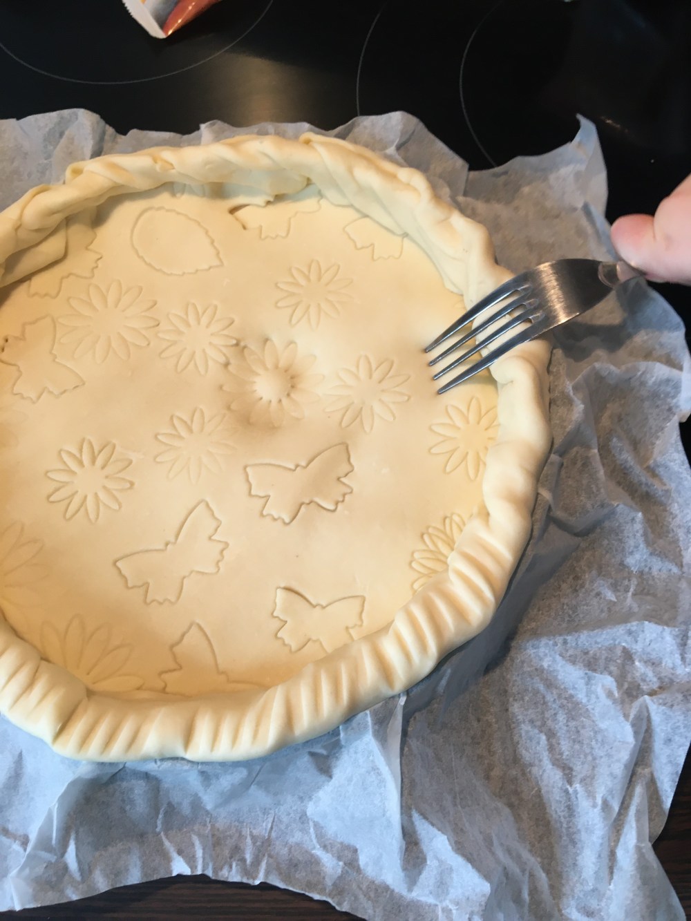 Ma fille a préparé la pâte du dessus en utilisant des emportes pièces. Laissez libre gout à votre imagination. Ici elle avait envie de mettre des fleurs des papillons un peu partout.