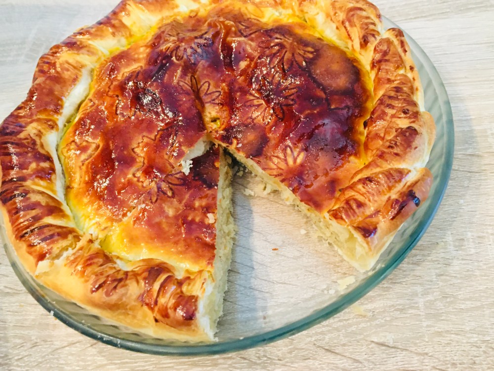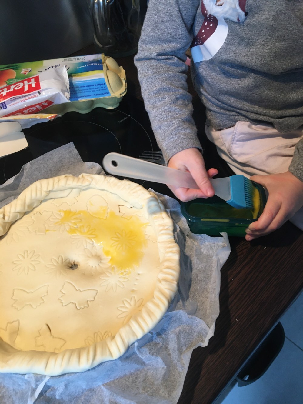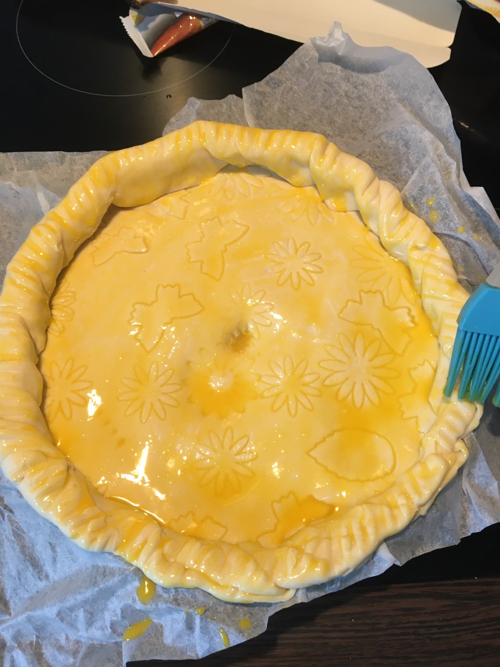 Badigeonnez le tout de jaune d’œuf si vous la voulez très dorée, d’un œuf entier si vous la voulez moins foncée. Nous on a mis un jaune avec une pointe de lait. On a fait un petit trou au centre pour ne pas que la pâte gonfle.