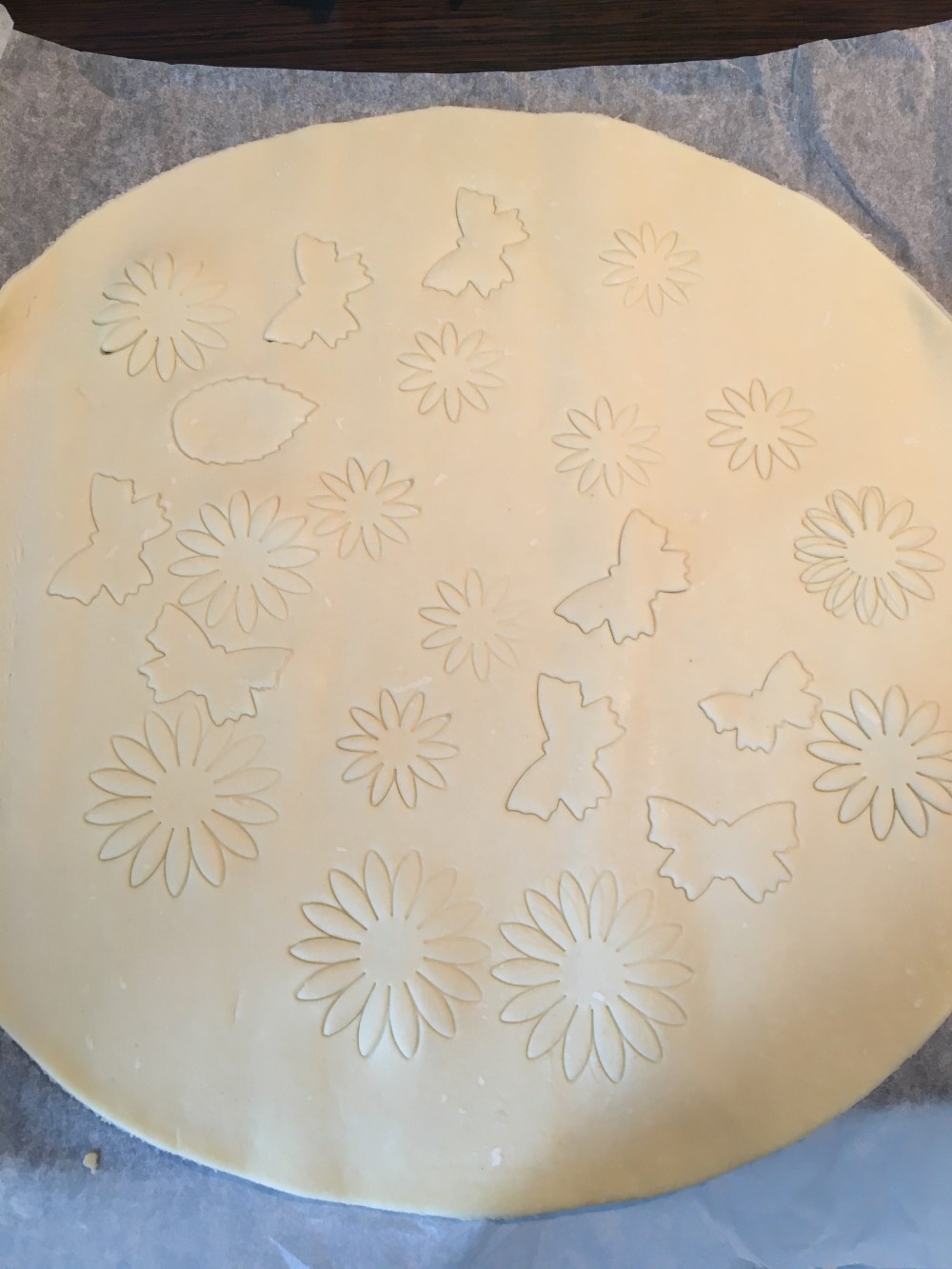 Ma fille a préparé la pâte du dessus en utilisant des emportes pièces. Laissez libre gout à votre imagination. Ici elle avait envie de mettre des fleurs des papillons un peu partout.
