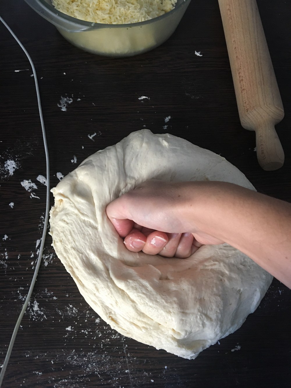 Ajoutez ensuite encore 21cl d’eau et mélangez jusqu’à obtention d’une pâte lisse et non collante. Ajoutez au besoin un peu de farine.
