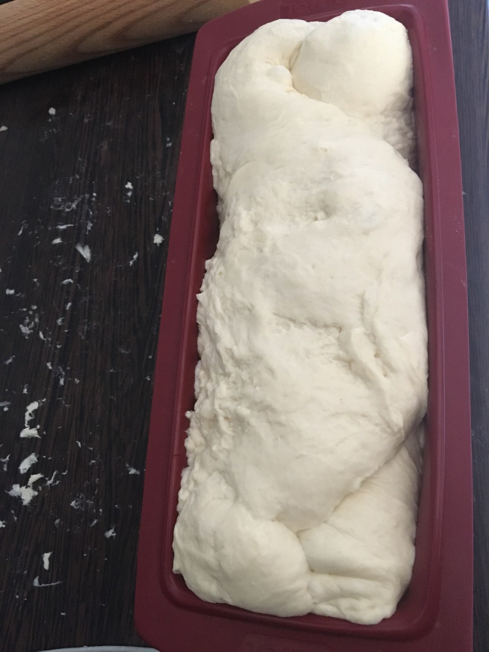 Du coup j’ai utilisé un moule en silicone mais ma pâte a tellement levée que avec le poids le pain est tombé sur le côté durant la cuisson. Un côté est moins cuit car forcément j’ai mis 30 min à m’en rendre compte…!