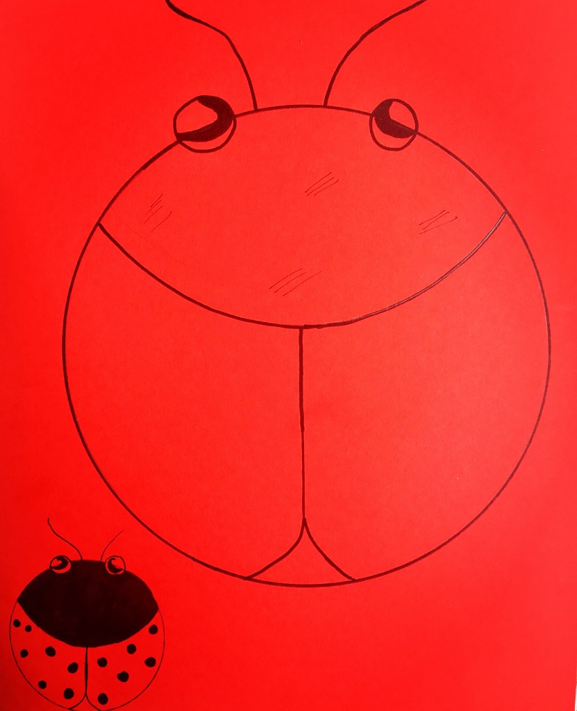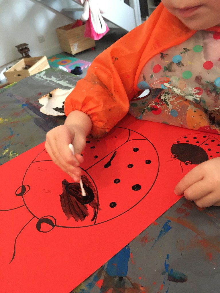 L’exercice consiste à faire des points noirs à l’aide d’un coton tige trempé dans la peinture. Et de peindre la partie de la coccinelle en noire comme sur le petit modèle.