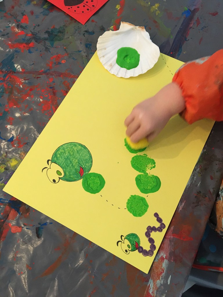 L’exercice consiste à réaliser des empreintes de peinture en forme de rond le long de la chenille, comme sur le petit modèle.