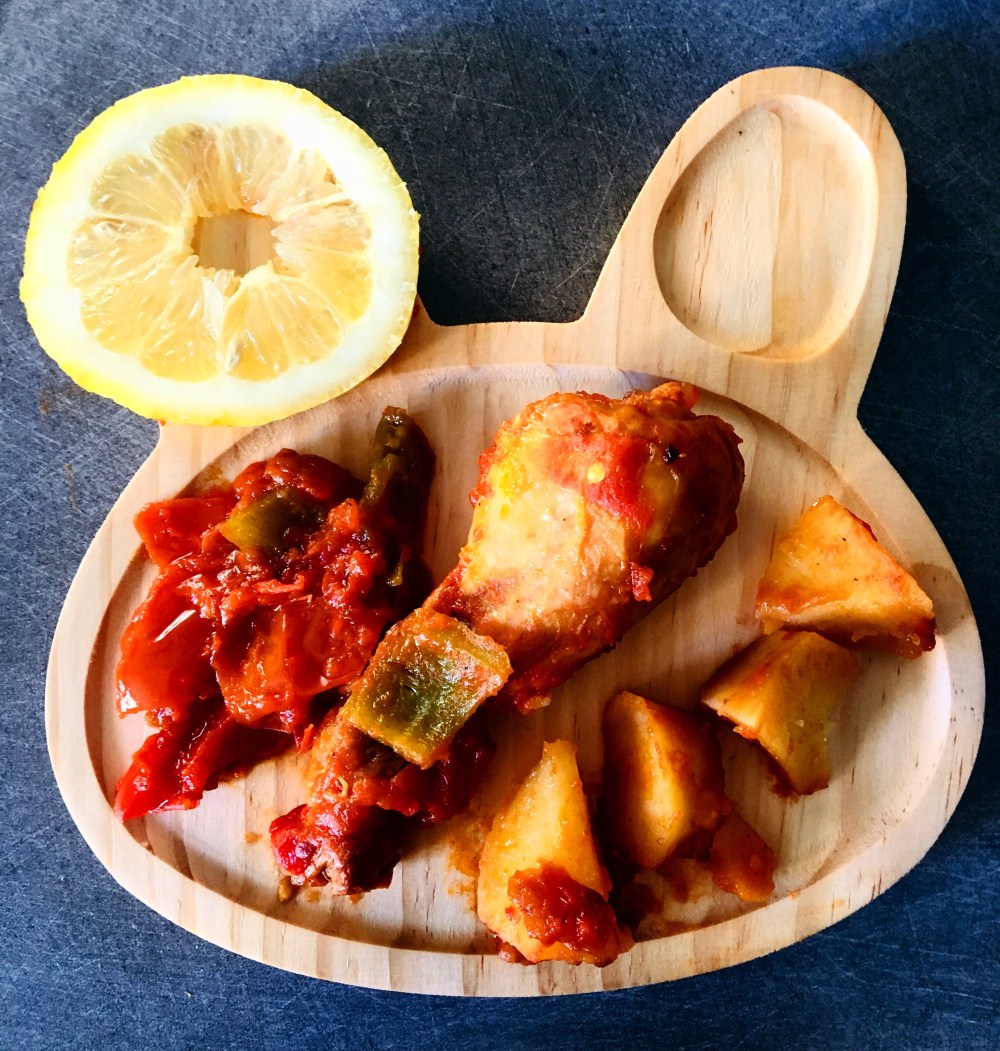 Dans une poêle de l’huile d’olive pimentée, un oignon, deux tomates, un poivron rouge et vert, et des morceaux de tomates en jus en boîte pour un peu plus de sauce. Laissez mijoter avec des quartiers de pomme de terre dedans. Quand le poulet est cuit le laisser mijoter pour qu’il prenne le goût de la sauce.