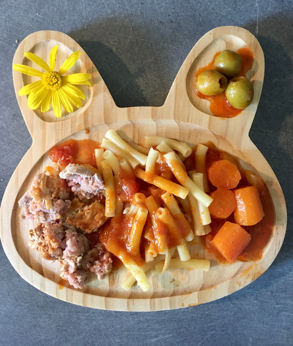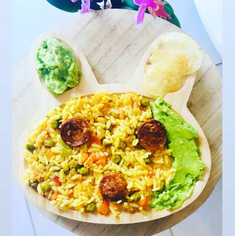 Ce soir c’est paella, accompagnée d’une petite purée d’avocat citron piments du jardin ( ils sont pas trop forts 💪) 3 chips pour le côté ludique et encore une petite assiette dévorée. Les quantités ne sont pas gravées car l’épaisseur de l’assiette est même pas d’un cm, ne vous y méprenez pas. Ma fille a un petit appétit ( chez moi car bien sûr chez la nounou elle avale le double) mais elle mange de tout.