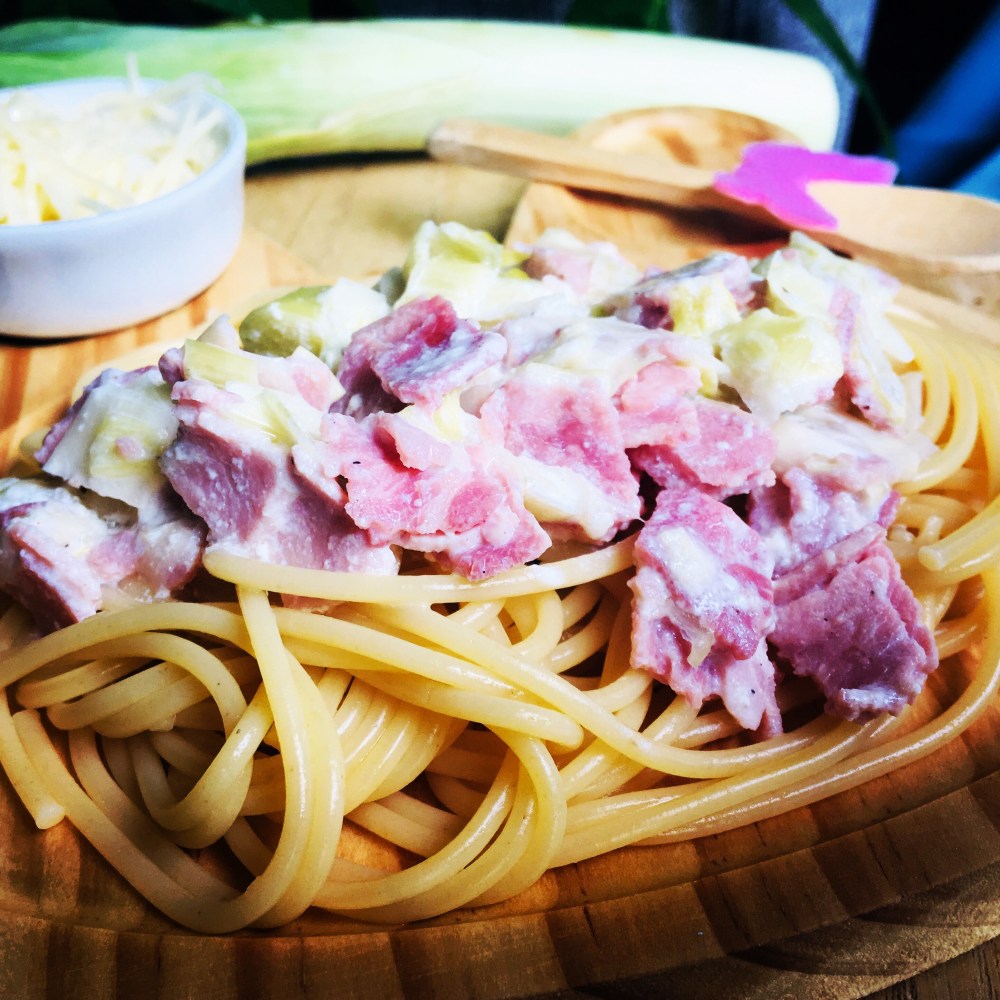 Pour ce repas, cuire à la vapeur des poireaux coupés en rondelles. Les faire revenir avec de l’huile à la poêle et du jambon. Puis ajouter la crème fraîche ou du fromage blanc. Voilà des pâtes carbonara bonne pour la santé. ( enfin meilleures )