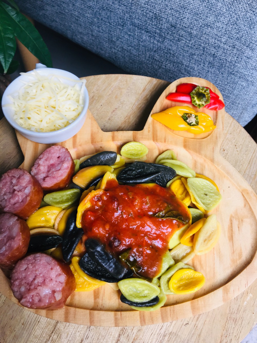 Le dimanche, on se casse pas la tête. Aujourd’hui c’est pâtes. La saucisse de montbéliard parce qu’on adore ça, une sauce tomate maison au basilic du jardin, préparée d’avance avec des tomates bien mûres et mise en bocaux. Les pâtes sont à l’encre de sèche, de carotte, de tomates et basilic, curcuma et betterave, et épinard. À la semoule de blé. Une vraie farandole de couleurs et saveurs, ce sont de vraies pâtes italiennes. Bien sûr il faut choisir une marque sans additif et colorants!