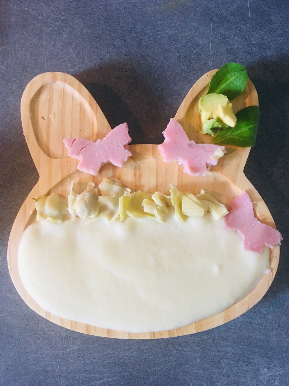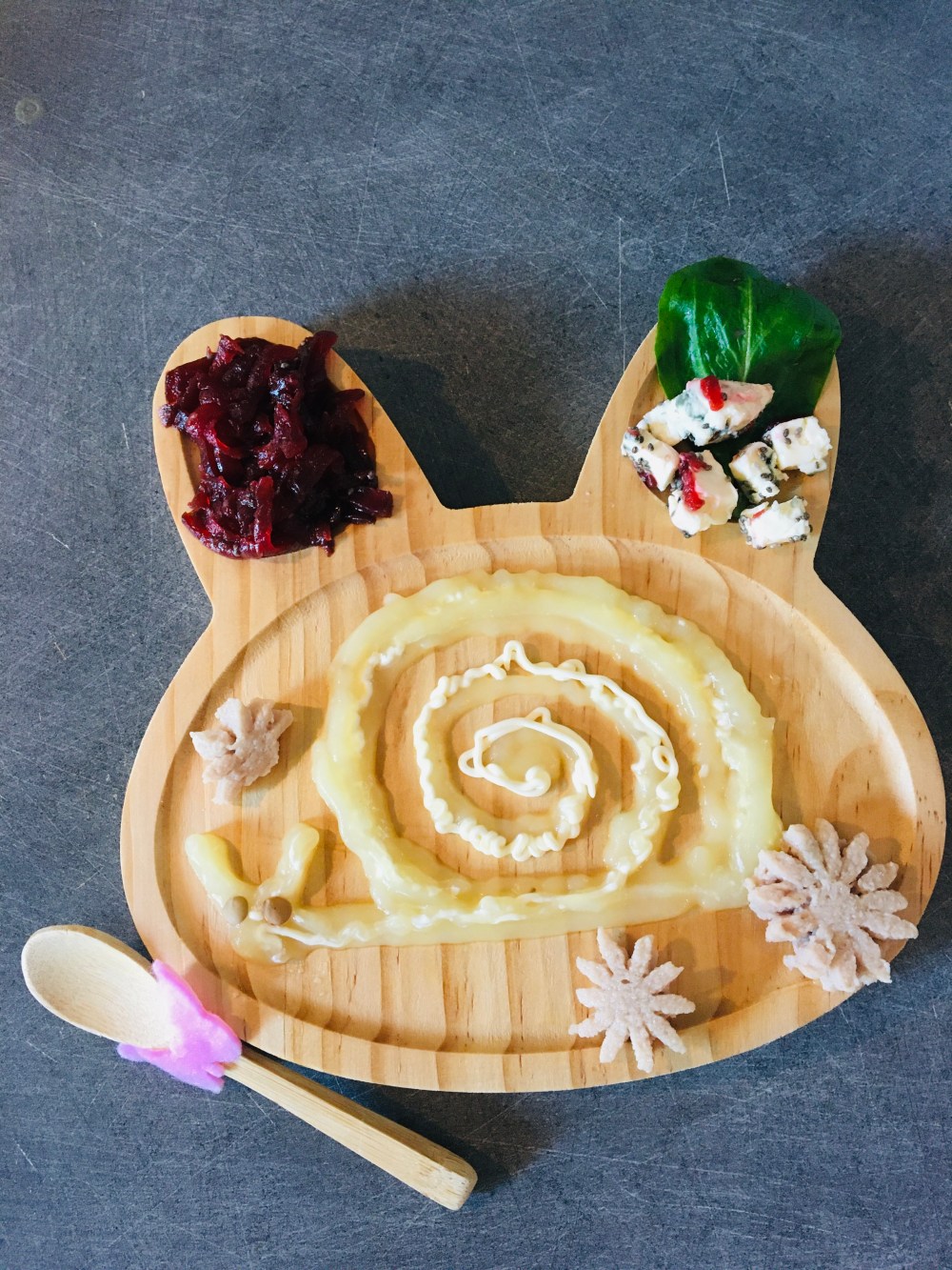 A midi repas en toute simplicité. Salade de betteraves mâché graines de chia et roquefort à l’huile de noisette. ( ma fille ne mange pas la salade verte elle n’aime pas ) puis purée de radis noir adoucie à la pomme de terre et boudin blanc. Ne pas donner cet aliment avant 18 mois voir 24 et occasionnellement car il est considéré comme une charcuterie.