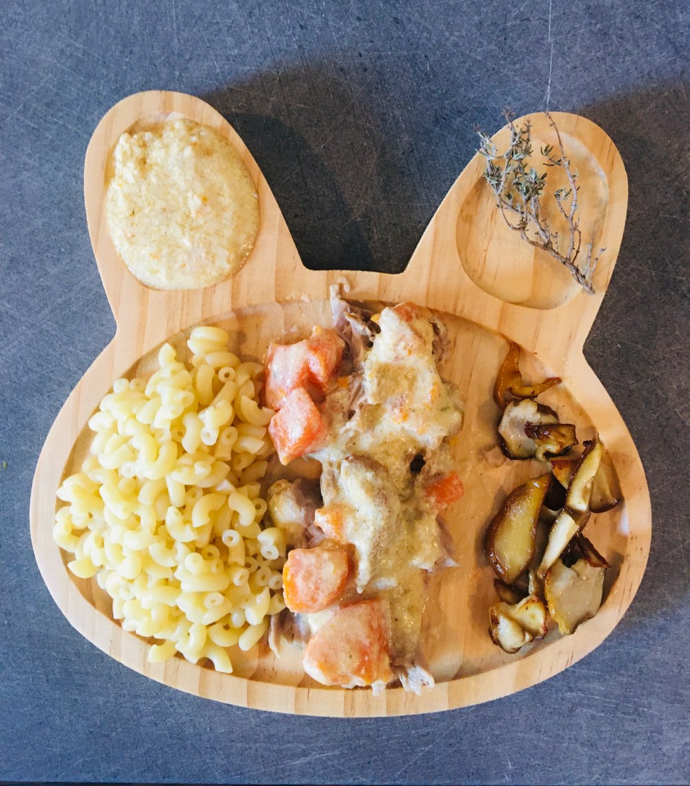Normalement la recette contient des champignons. Nous avons eu le luxe d’avoir de magnifiques cèpes que j’ai fais dorer dans une poêle à part pour ne pas dénaturer sa saveur, mais aussi bien les cuire pour éviter la toxoplasmose et une meilleure digestion. C’était un vrai régal! Bien sûr il s’agit d’une recette archi simplifiée de la blanquette traditionnelle. Parfaite pour les enfants et les mamans en gain de temps. Pour bébé, quand il mangeait des petits morceaux je mixais tout simplement la viande les champignons et gardais la sauce sans crème avec ajout de vache kiri. Si les coquillettes étaient trop grosses au début je mettais des pâtes alphabet. Un délice aussi.