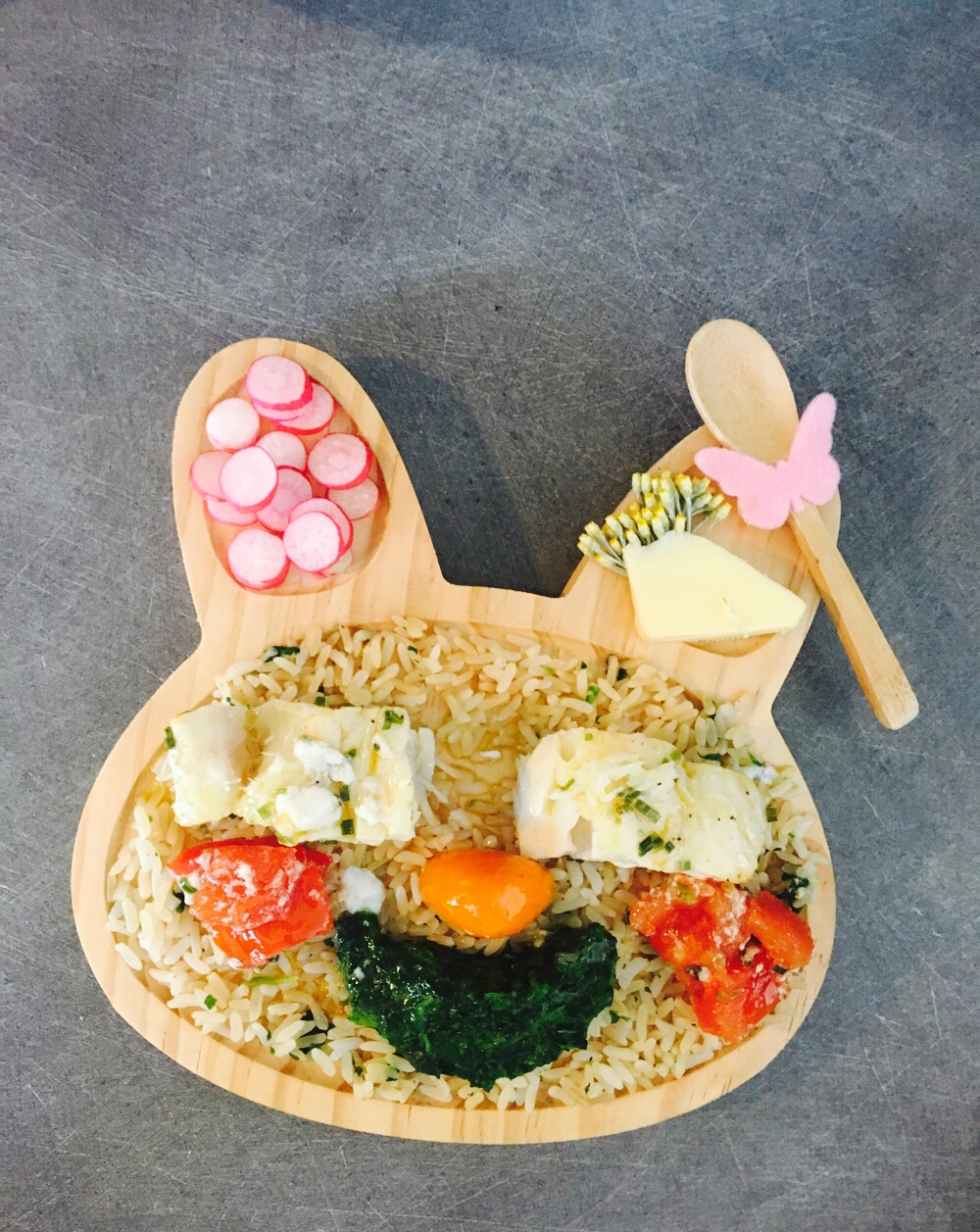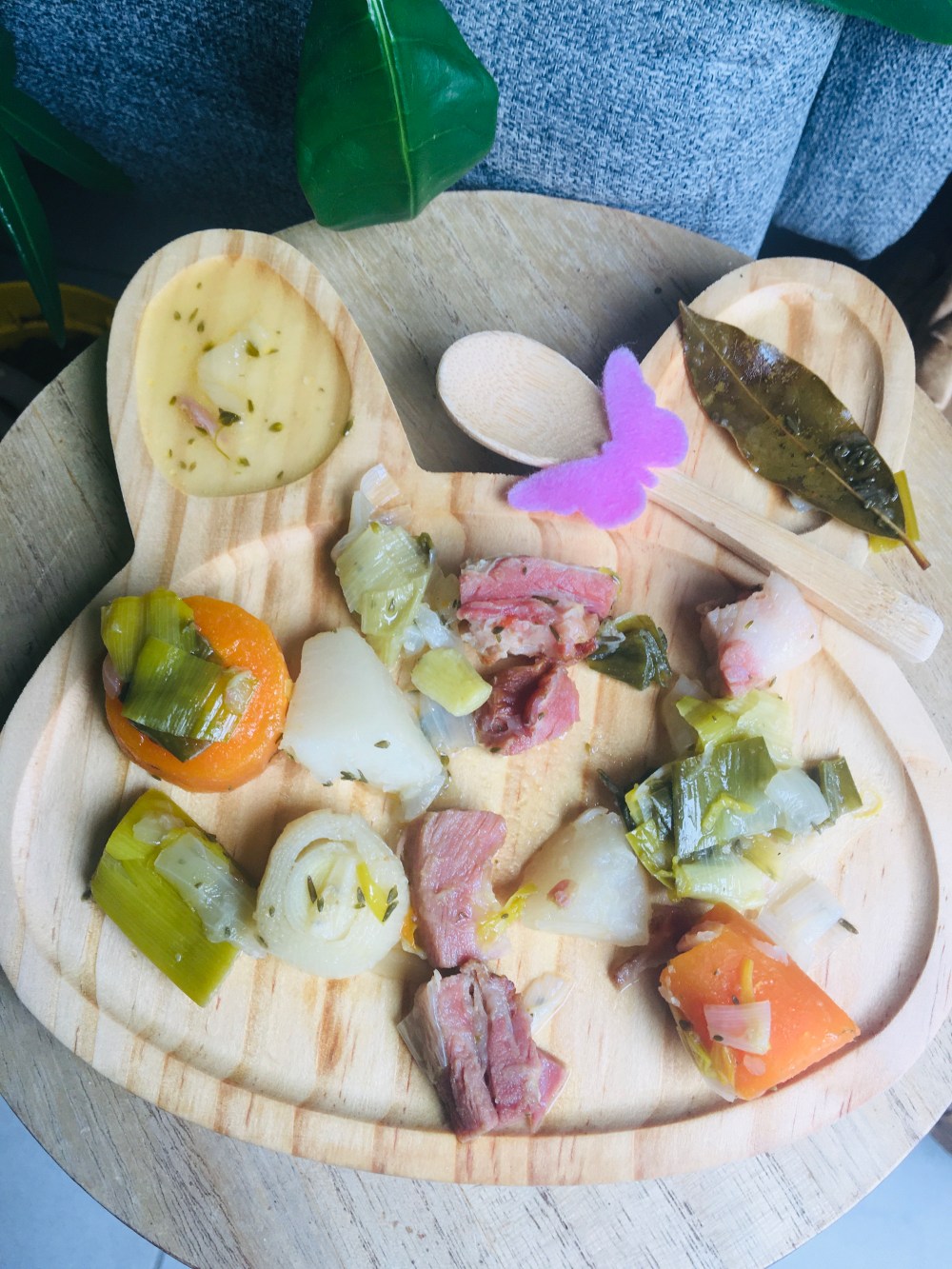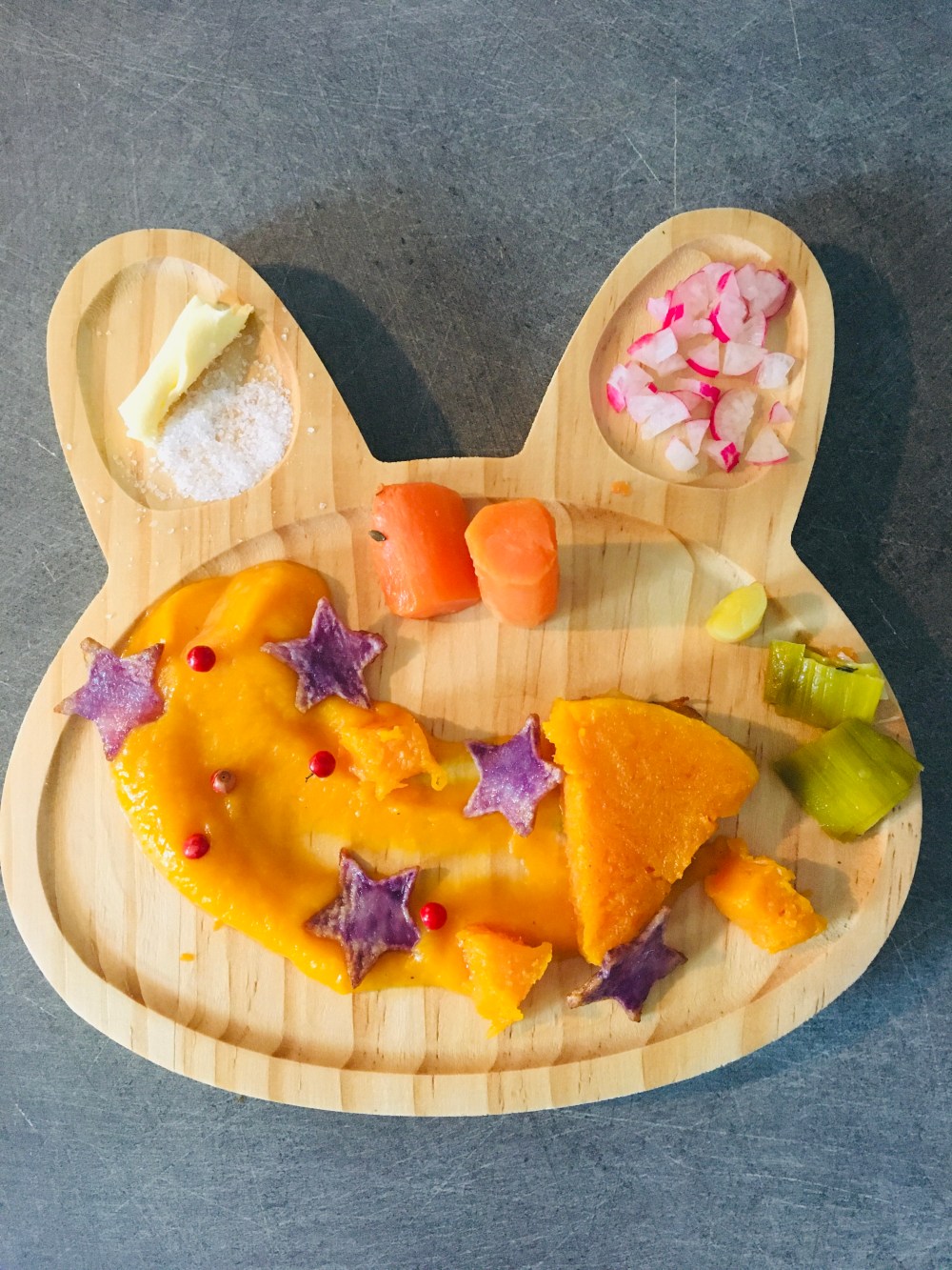Ici on a simplement sa petite entrée de radis à tremper dans le beurre et le sel. Les pommes de terres violettes coupées avec un emporté pièce puis plongée dans de l’huile bouillante 3 min. Elles sont craquelantes comme des chips car elle aime ça, pour papa j’en ai fais des frites. Les restes de carottes et poireaux de la veille 🙂 et la purée cuite à la vapeur du butternut avec un peu de vache kiri pour le côté fondant. Les petits morceaux de butternut ont été rôtis au beurre vanillé avec une branche de thym. Une assiette qui peut être servie le soir sans viande, sinon j’avais prévu d’ajouter des rouleaux de chorizo ou jambon ça se marie bien, mais ma fille ne mange finalement pas là à midi 🤪 ce sera ce soir 🙂