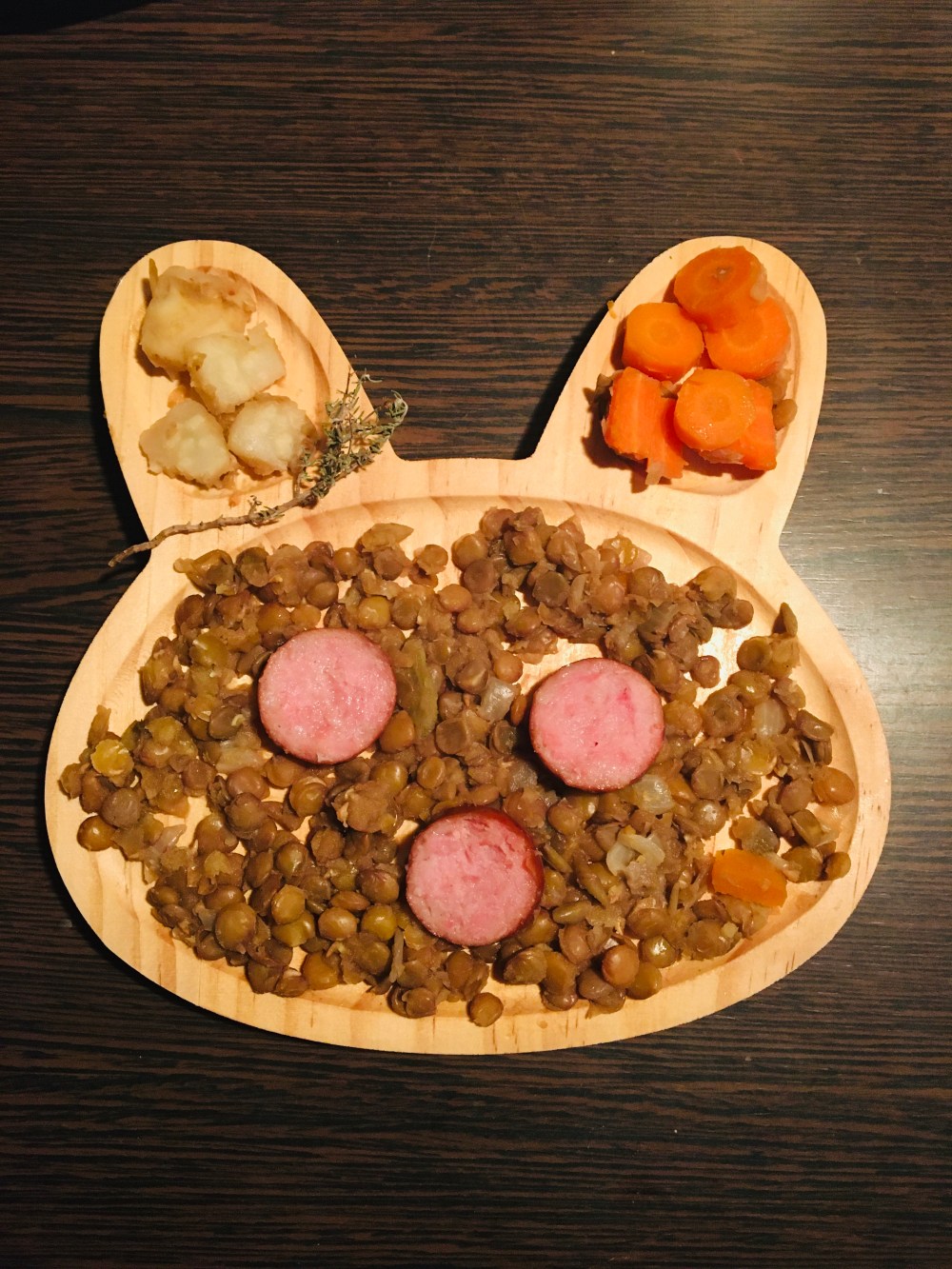 Les lentilles! Riches en protéines végétales, en fibres, elles ont un effet très rassasiant. Elles sont bien sûr riches en fer et autres minéraux. Top pour les enfants! Je les ai cuites avec de l’oignon de la carotte et du celeri, que je fais revenir au fond de la casserole avant d’ajouter les lentilles et couvrir d’eau 20min. Je rajoute ensuite la saucisse et je recuis 20min. Une branche de thym pour donner du goût.