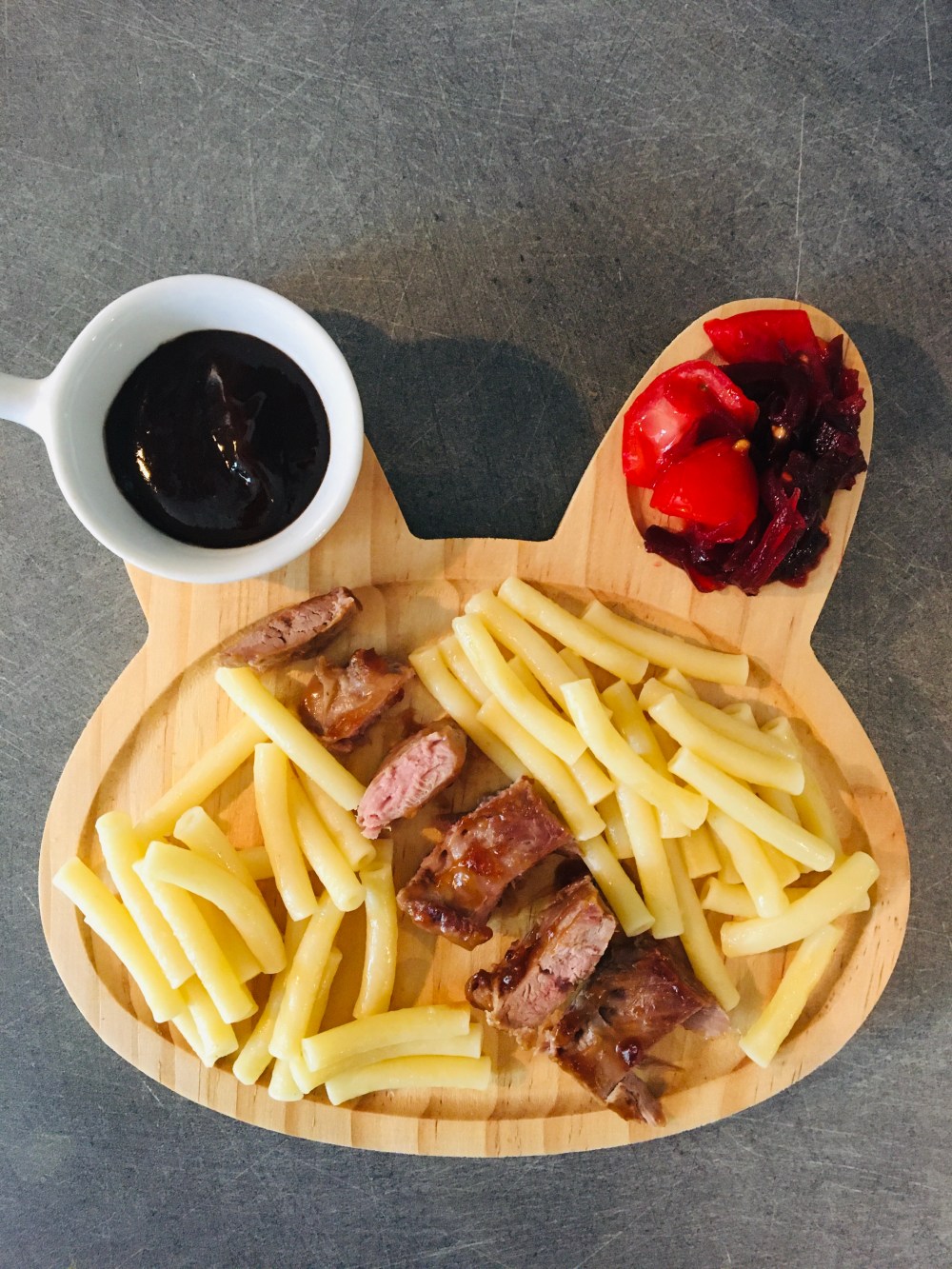 Aujourd’hui, repas sucré salé. Pas forcément dans mes habitudes car je n’en suis pas friande, mais avec le canard il faut avouer que c’est bon. Pour tester ces nouvelles saveurs avec ma fille, j’ai choisi des pâtes, ce que je fais chaque fois que j’introduis quelque chose de nouveau. C’est neutre, et elle aime. J’ai mis la sauce à part car je respecte si elle n’aime pas. Elle a trempé le doigt, elle a dit mais oui c’est délicieux! Et a tout renversé sur son plat.
