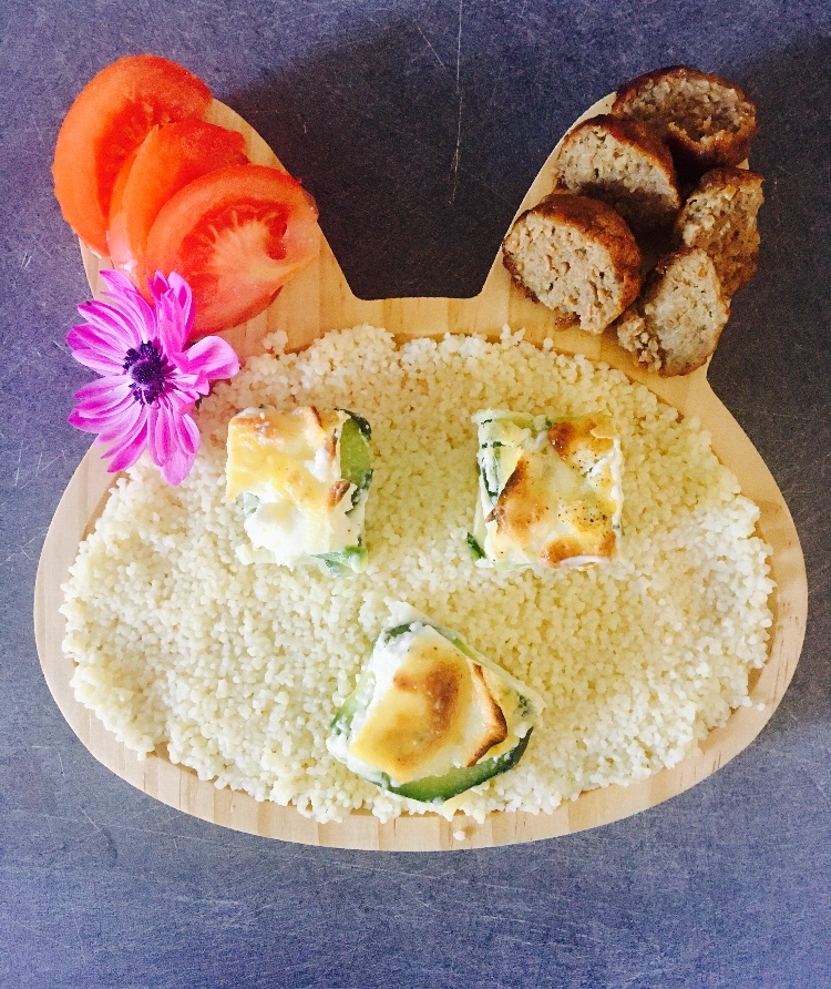 Simple semoule, flanc de courgette au fromage de chèvre et boulettes de viande. Tomates en entrée 🙂 recette de fond de placard et congélateur !