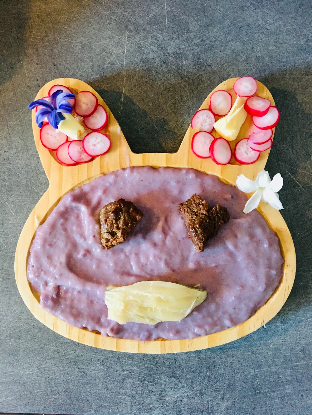 Ici on a simplement sa petite entrée de radis à tremper dans le beurre et le sel. Les pommes de terres violettes coupées avec un emporté pièce puis plongée dans de l’huile bouillante 3 min. Elles sont craquelantes comme des chips car elle aime ça, pour papa j’en ai fais des frites. Les restes de carottes et poireaux de la veille 🙂 et la purée cuite à la vapeur du butternut avec un peu de vache kiri pour le côté fondant. Les petits morceaux de butternut ont été rôtis au beurre vanillé avec une branche de thym. Une assiette qui peut être servie le soir sans viande, sinon j’avais prévu d’ajouter des rouleaux de chorizo ou jambon ça se marie bien, mais ma fille ne mange finalement pas là à midi 🤪 ce sera ce soir 🙂