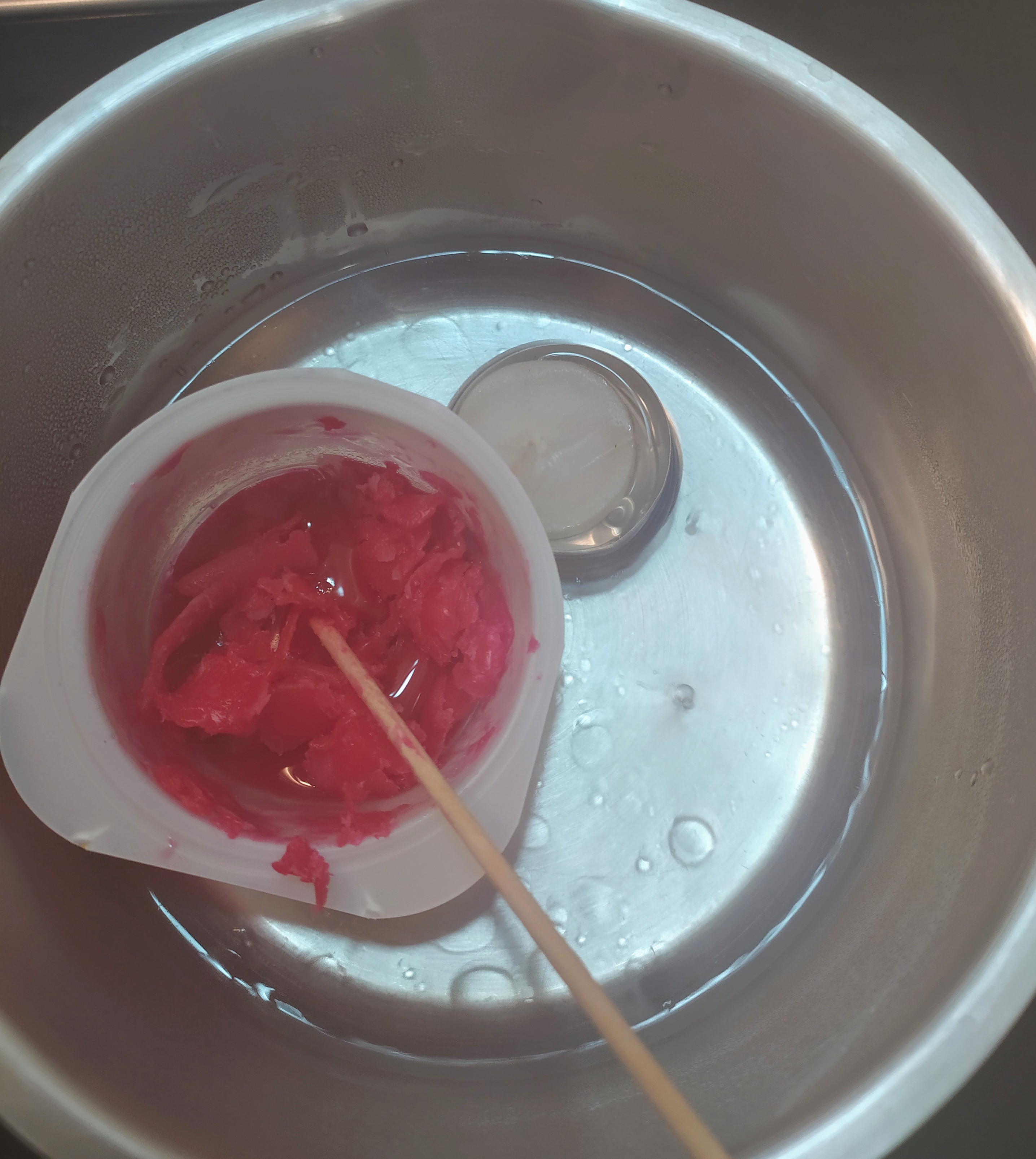 Faire fondre au bain-marie la bougie chauffe-plat plat et la cire en remuant régulièrement.