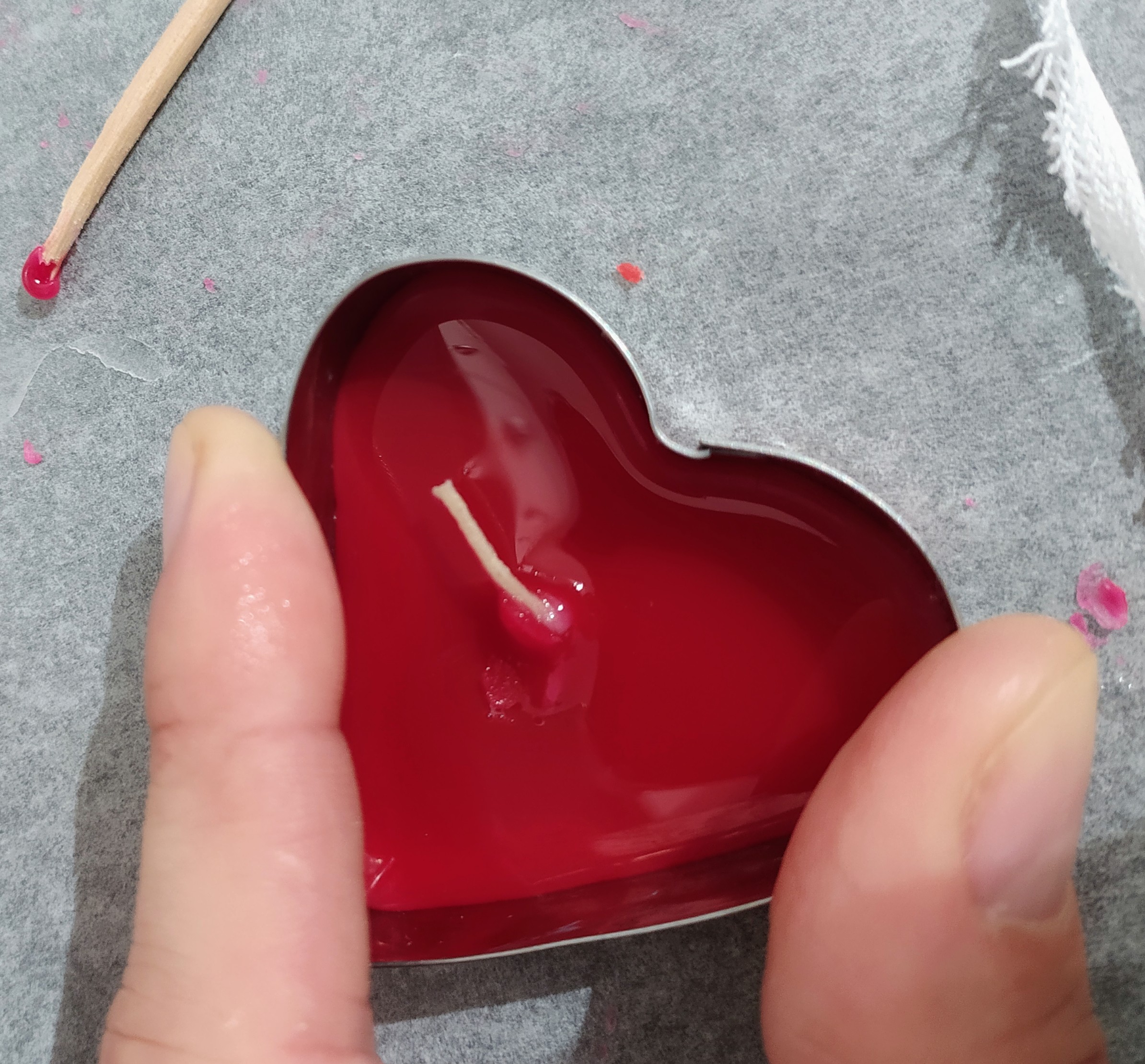 1) Pour une bougie en forme de coeur, versez directement la cire fondue dans l’emporte pièce ou dans un petit moule. J’ai récupéré la mèche de la bougie chauffe plat et l’ai glissée au milieu, sinon vous pouvez y mettre le fil de coton. Maintenez l’emporte pièce quelques secondes et laissez durcir.