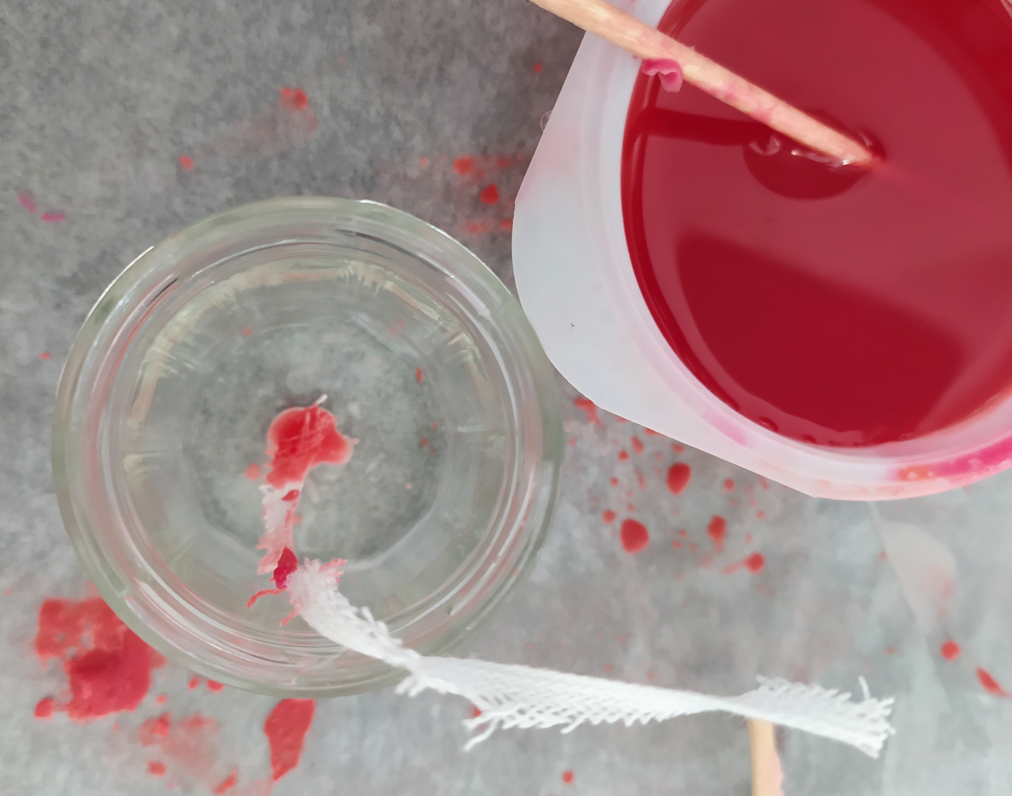 2) Pour une bougie dans un pot à confiture, faites fondre la cire comme précédemment puis fixez la mèche de coton avec un peu de cire au milieu du pot et laissez sécher.