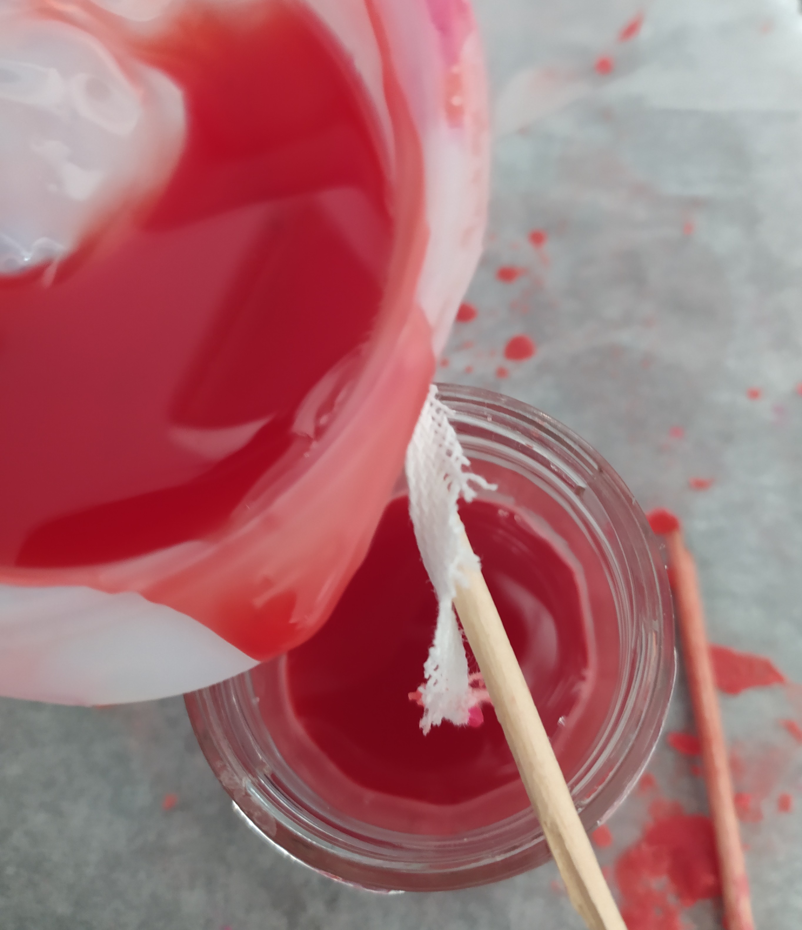 3) Pour une bougie en dégradé de roses, fixez la mèche avec un peu de cire au centre du pot. Versez 1/4 du pot de cire fondue rouge en maintenant la mèche au centre, laissez sécher ou mettez la quelques secondes au frigo. Mélangez un peu de cire rouge avec de la cire blanche de la bougie chauffe-plat et remplir 1/4 du pot. Recommencez avec de la cire blanche et un peu de rouge. Terminez par uniquement de la cire blanche pour le dernier 1/4. Une fois la cire durcie, découpez le pot de yaourt et retirez le complètement.