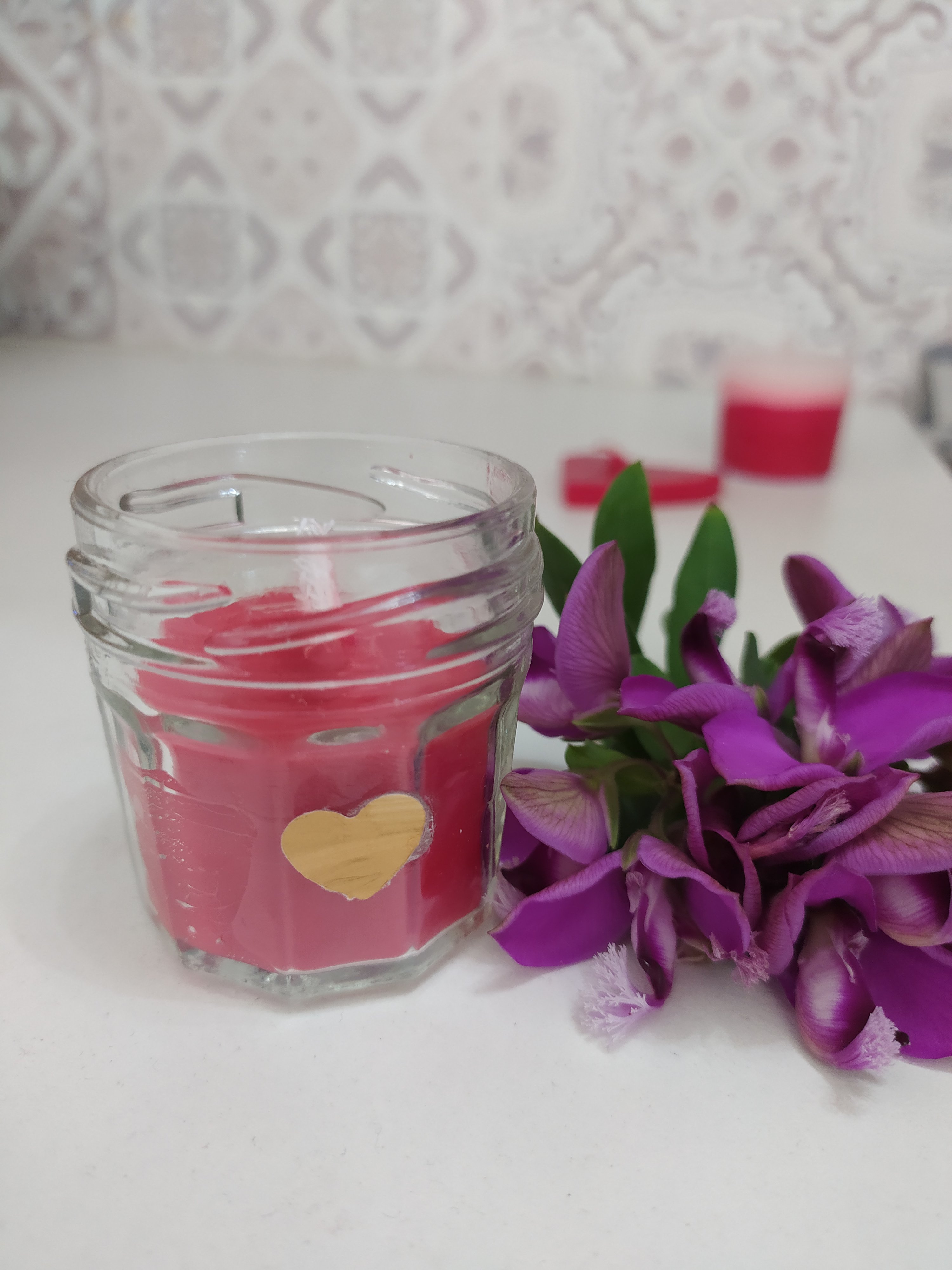 Versez la cire en maintenant la mèche au centre, laissez durcir. Décorez ensuite le pot, ici avec une gommette cœur.