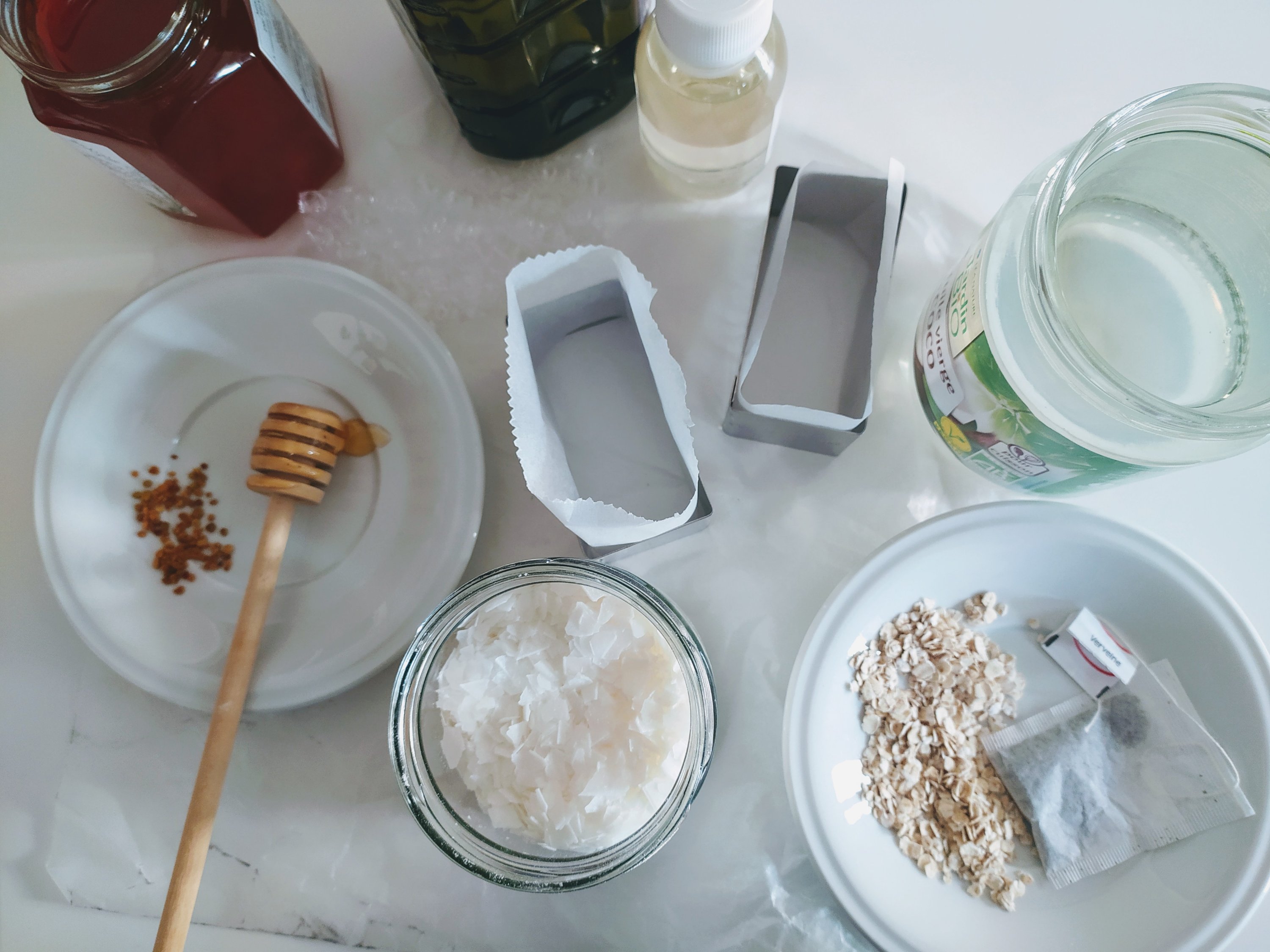 - Les ingrédients de votre choix : miel, avoine, verveine, lavande, sel de mer…