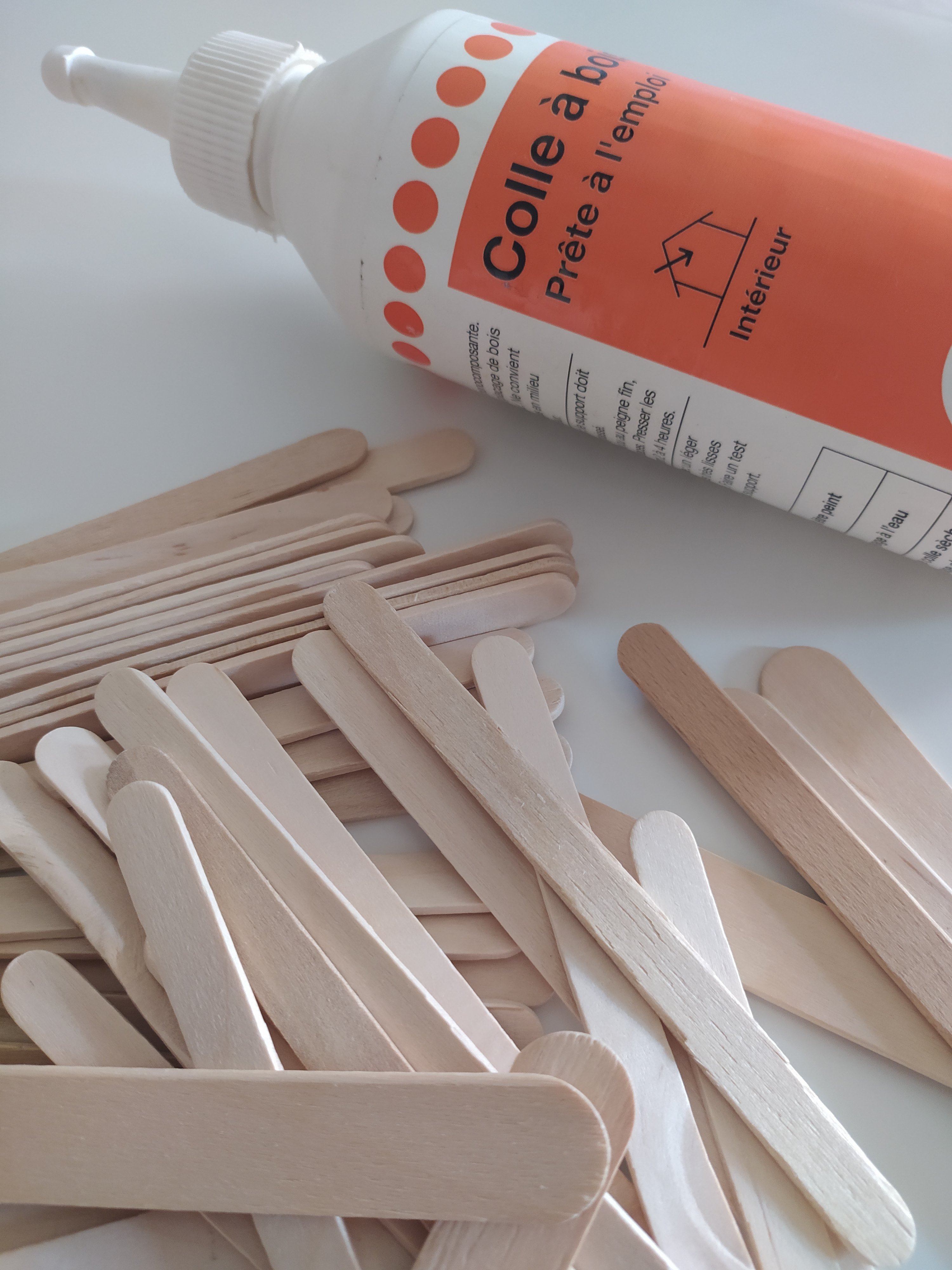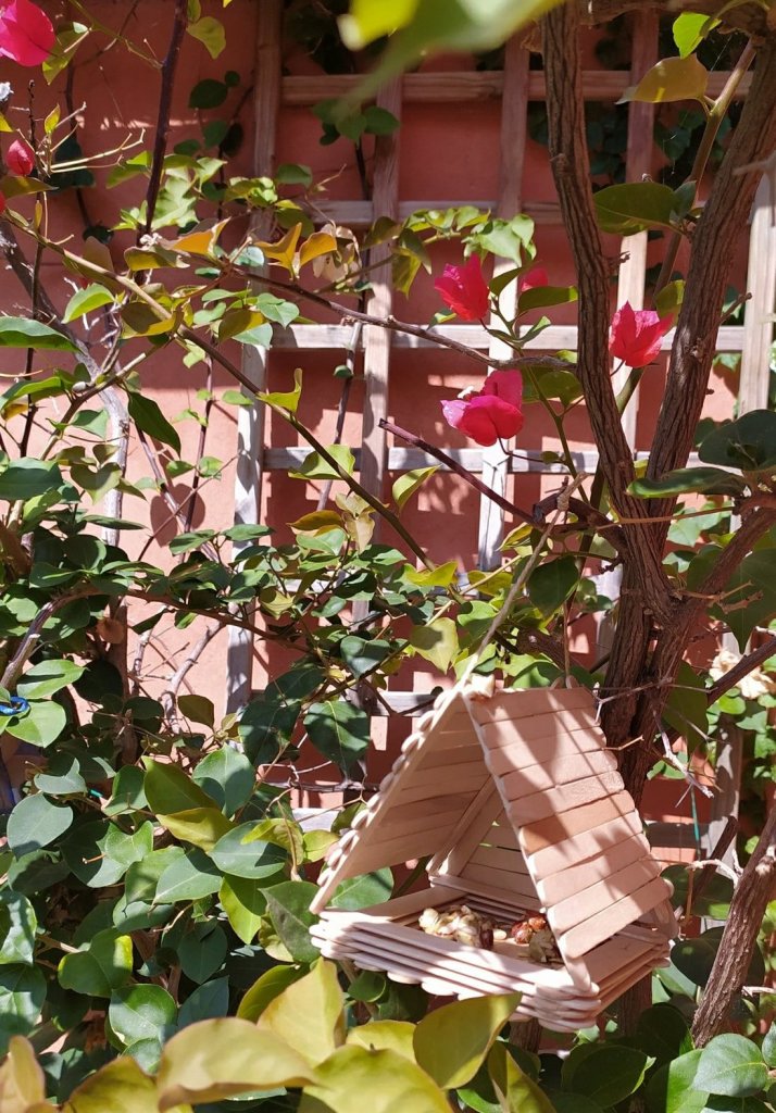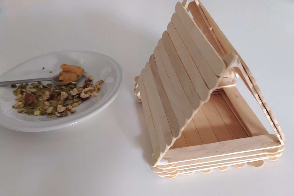 Voici une petite mangeoire à oiseaux fabriquée avec une cinquantaine de bâtonnets en bois (mangez beaucoup de glaces 🙂 sinon on en trouve aussi dans le commerce au rayon loisirs créatifs) et de la colle à bois.