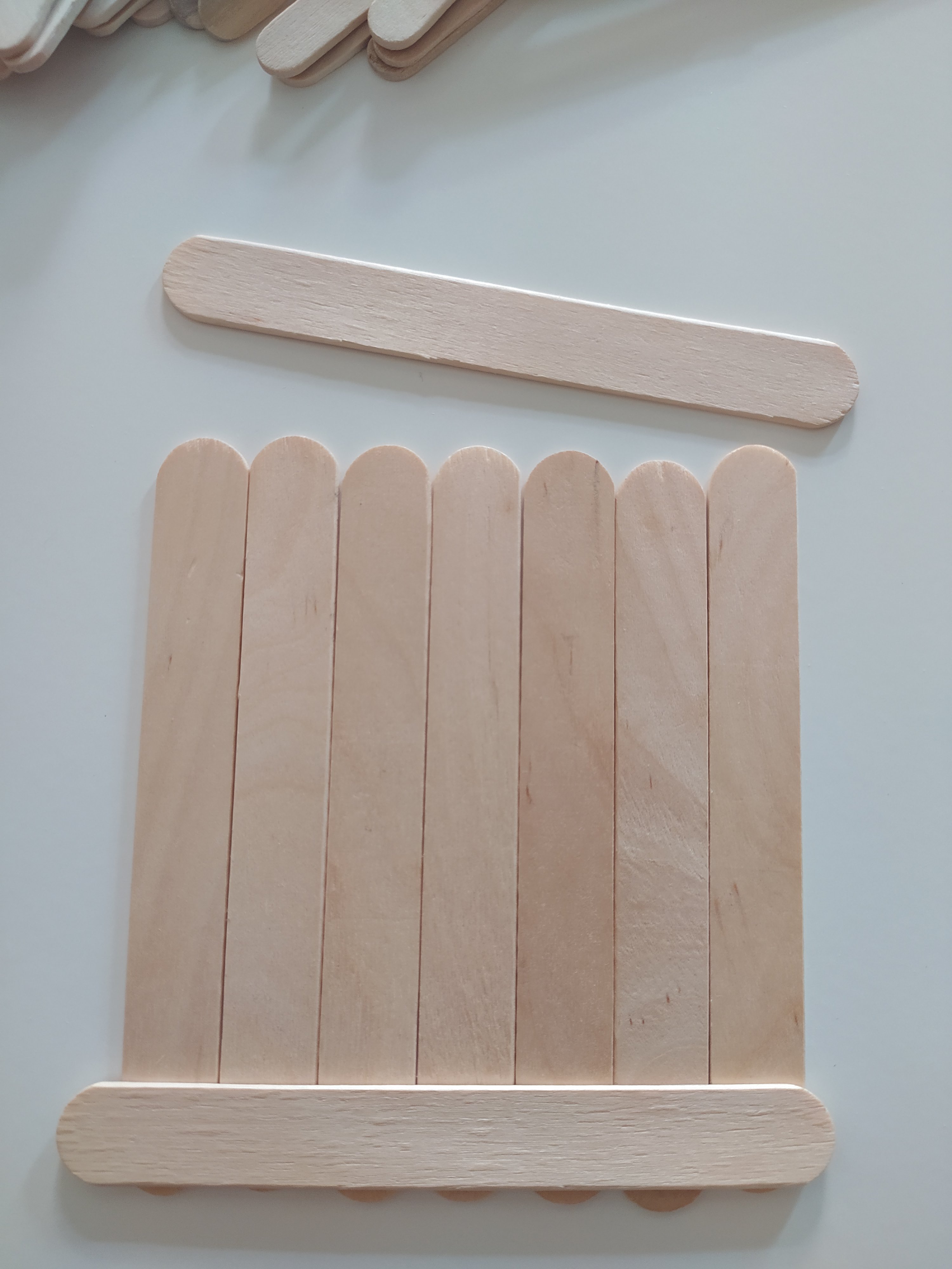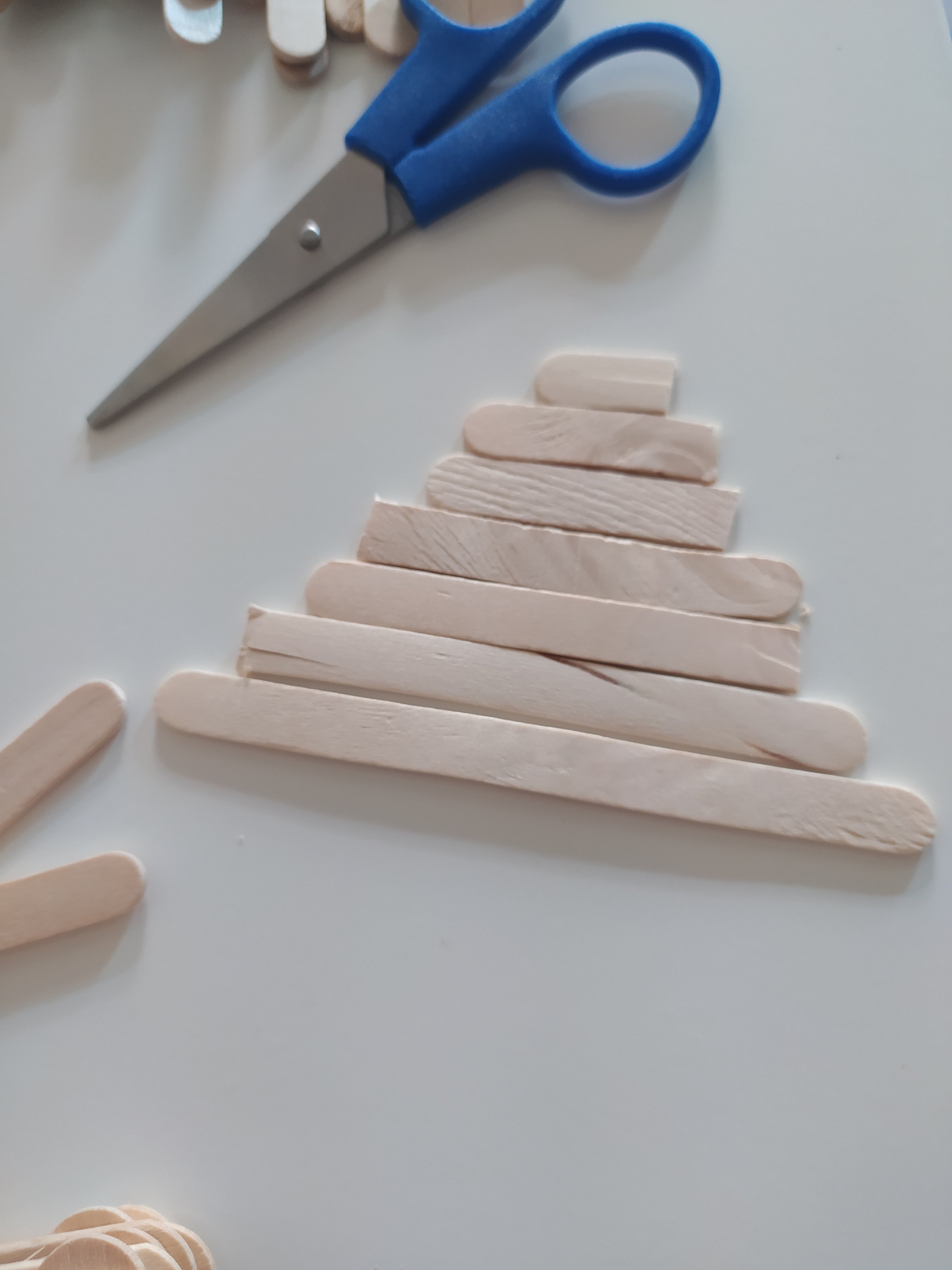Pour fabriquer le toit, procédez comme précédemment en alignant des bâtonnets puis en les fixant avec 2 bâtonnets collés aux extrémités. À réaliser deux fois. Pour le fond du toit, nous avons coupé les bâtonnets de tel sorte que 7 bâtonnets soient alignés en triangle du plus petit au plus grand. Les fixer avec deux bâtonnets sur les côtés.