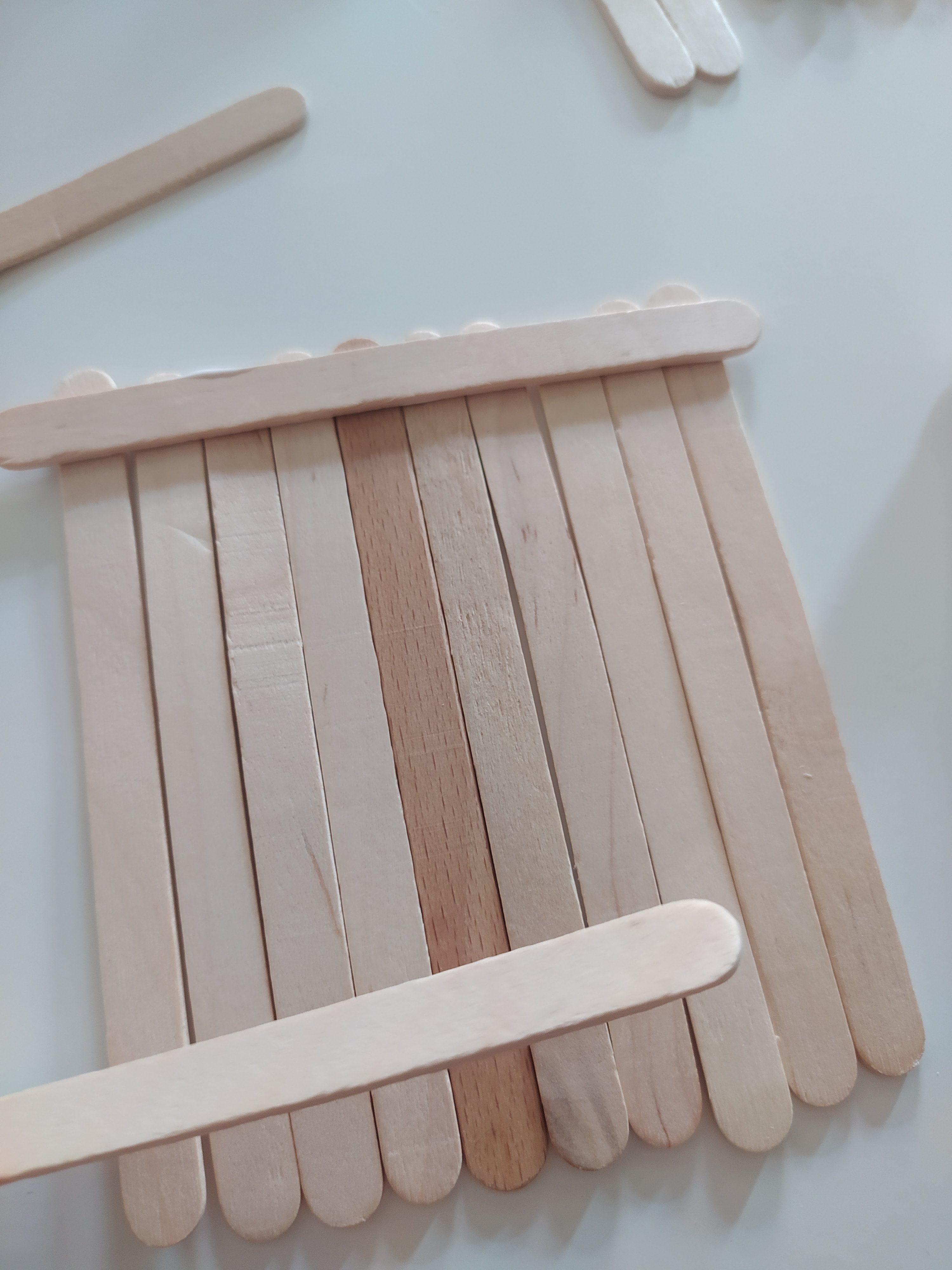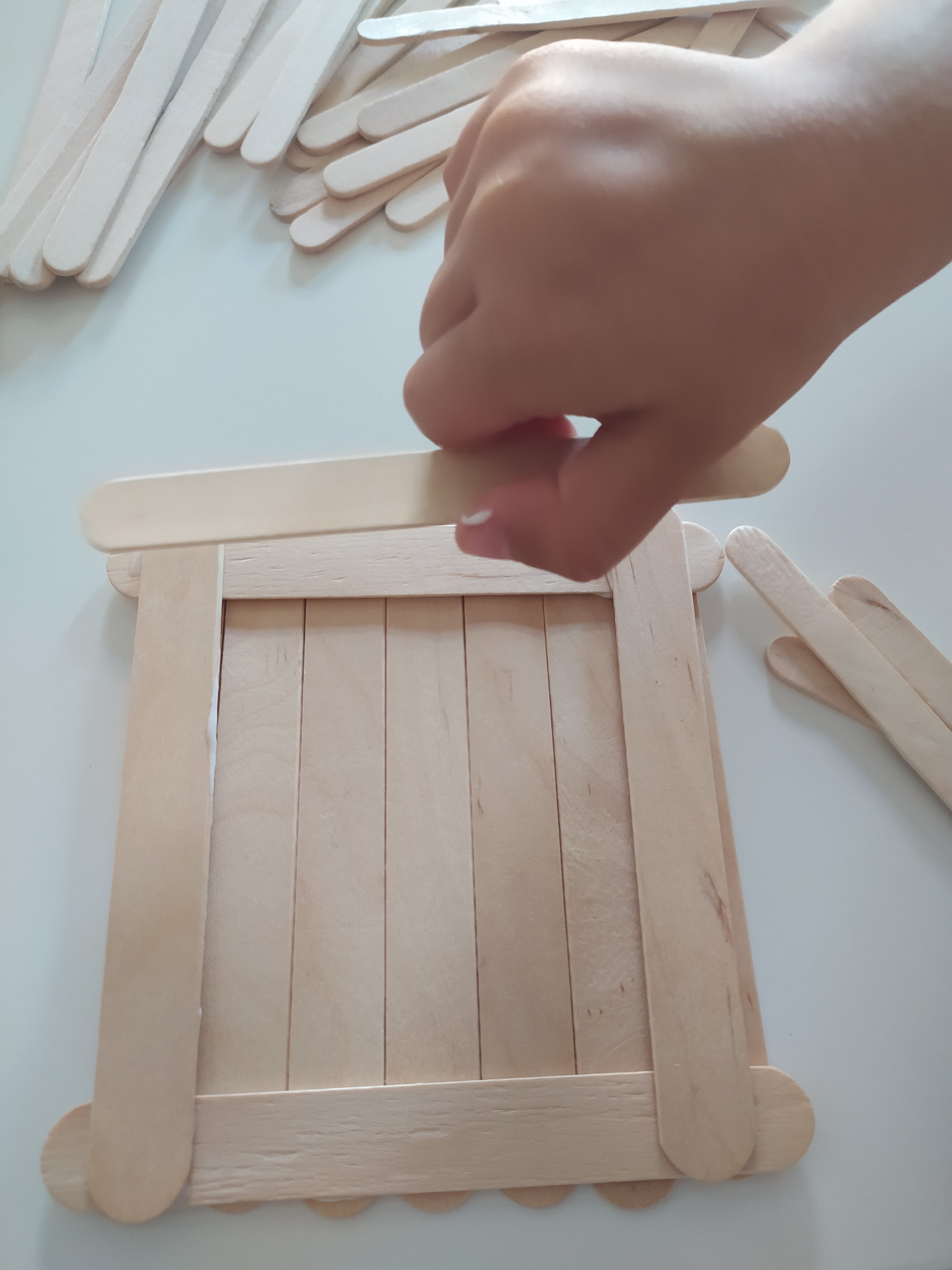 Le sol de la cabane est réalisé en alignant 7 bâtonnets. Pour les fixer, nous avons collé 2 bâtonnets à chaques extrémités. Pour former le socle, continuez à coller successivement 2 bâtonnets en sens inverse jusqu’à avoir une hauteur suffisante pour y déposer des graines.