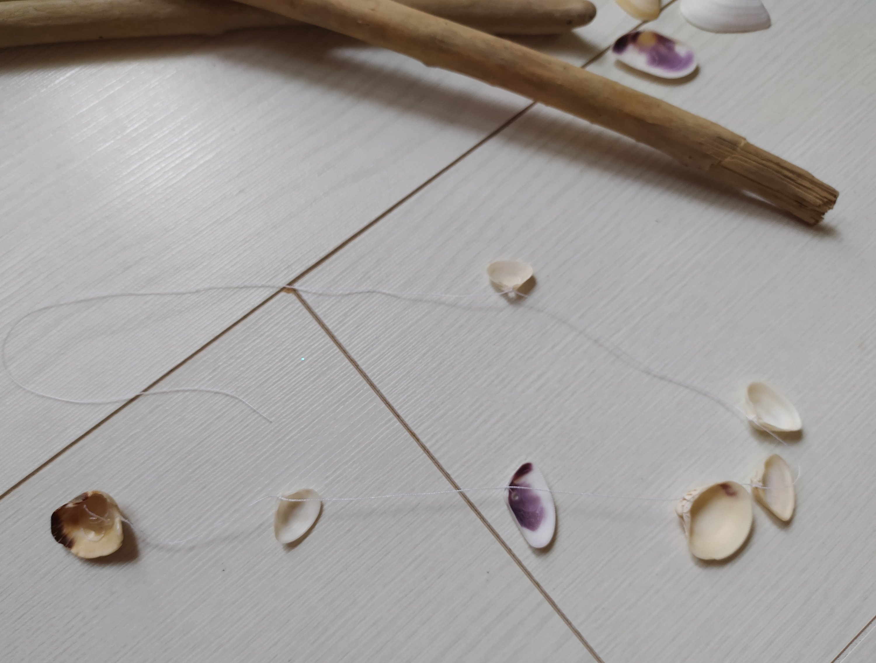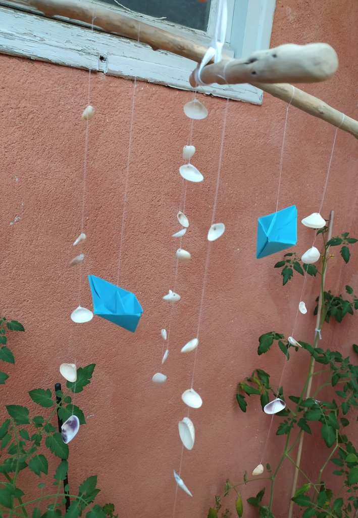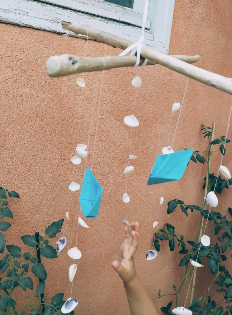 Collez deux morceaux de bois flotté en croix puis accrochez-y les ficelles de coquillages. Une à chaques extrémités et une au centre. Pour un effet coloré, nous avons ajouté deux bateaux en origami bleu. Il ne vous reste plus qu’à regarder votre mobile et rêver de vos vacances 🐚