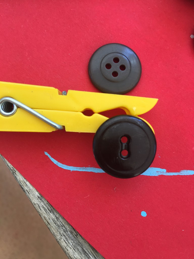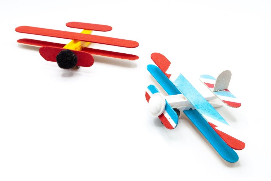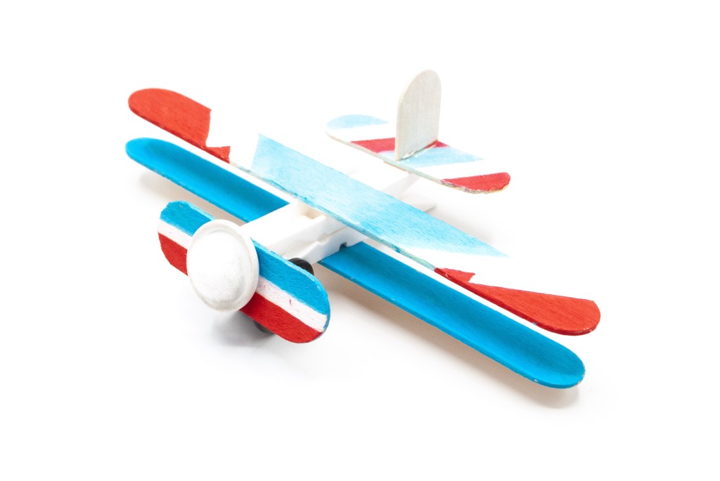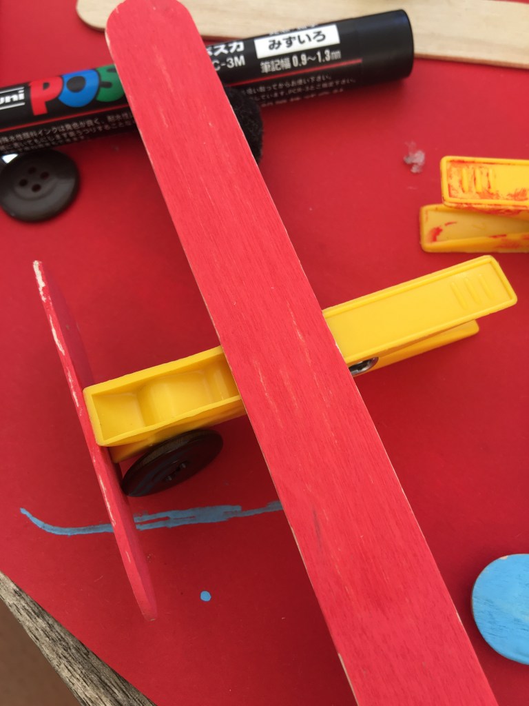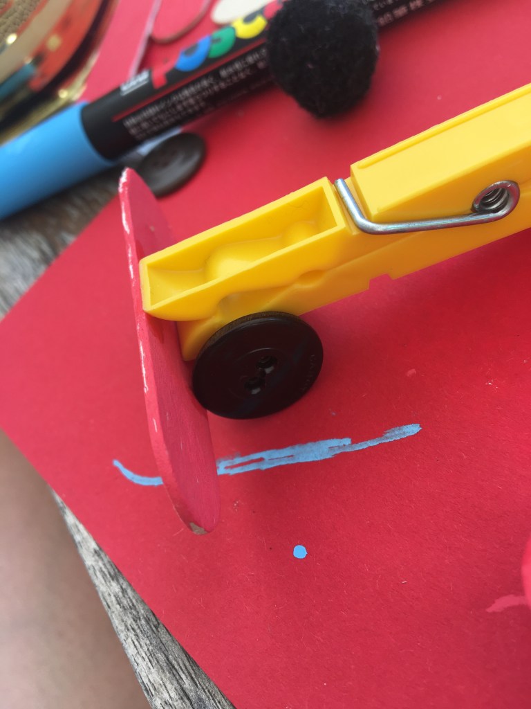 Je n’avais pas de petits bâtonnets, aussi j’ai découpé deux petits. Avec un bon ciseau c’est facile. Collez des roues assez grandes de chaque côté de la pince à linge Collez ensuite les bâtonnets préalablement recouvert de peinture et séchés. Collez ensuite un long bâtonnet dessus et dessous, puis un à l’arrièreAjoutez ensuite un bouton devant ou un pompon. Vous pouvez également ajouter un petit morceau de bâtonnet à l’arrière. Ma fille a réalisé son propre avion pendant que je faisais le mien. N’hésitez pas à partager les vôtres ! vous pouvez en faire plusieurs pour ensuite les suspendre et réaliser un joli mobile.