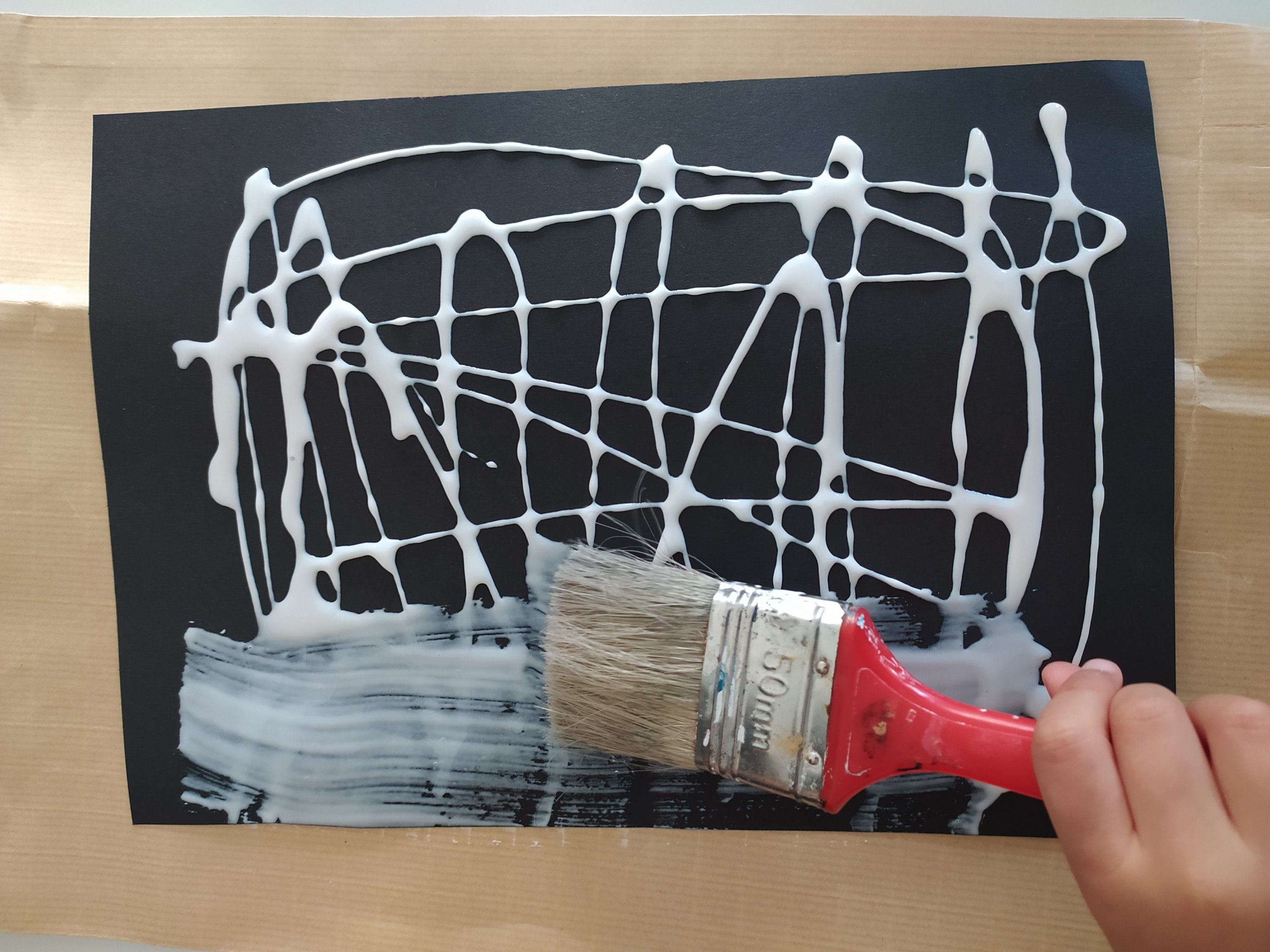 Commencez par peindre votre feuille noire avec la colle blanche. Une fois bien sèche, passez de la craie blanche sur toute votre ardoise puis bien frotter avec un papier pour étaler la poudre de craie. Pour renforcer votre ardoise, vous pouvez la coller sur du carton.