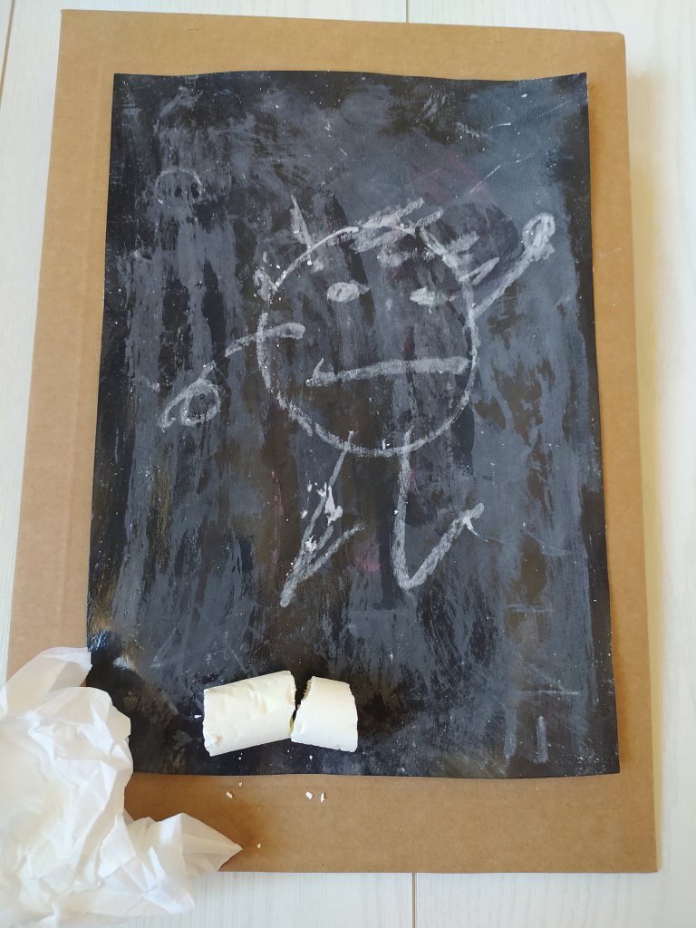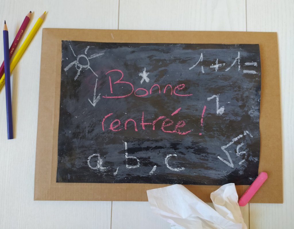 Fabriquez une ardoise avec une feuille cartonnée noire, de la colle blanche et une craie.