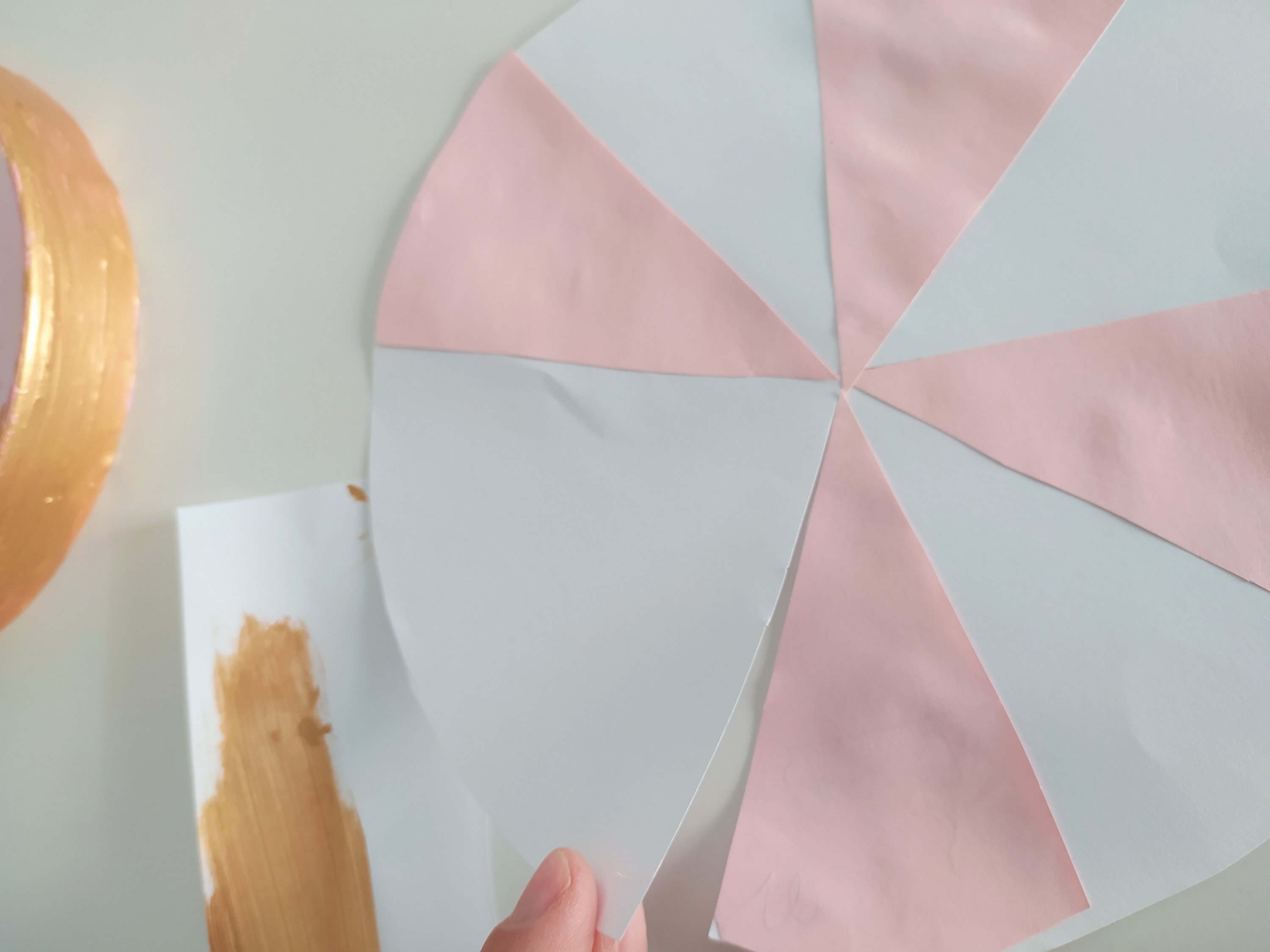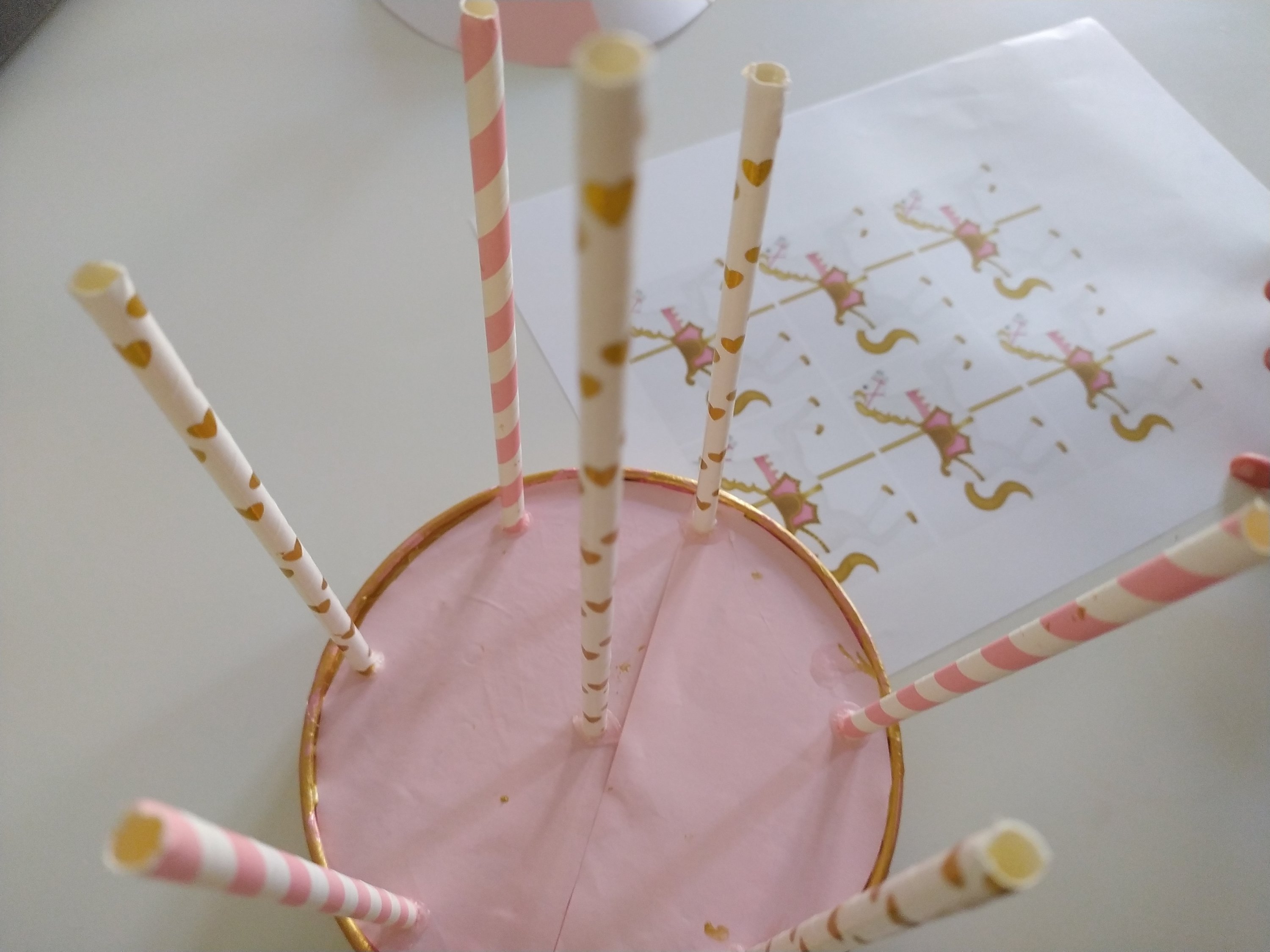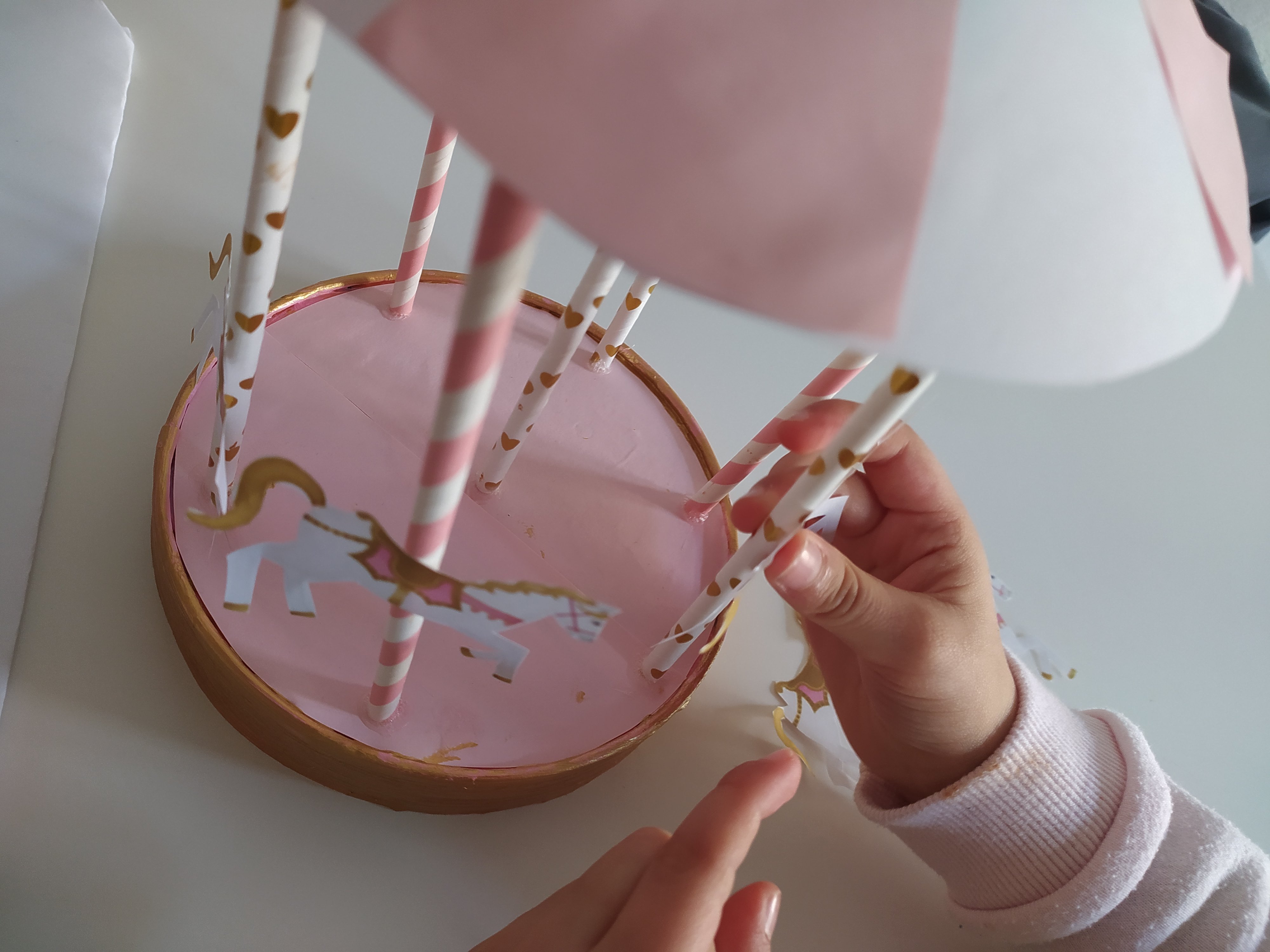 Commencez par découper un cercle dans du papier blanc (un peu plus grand que votre carton rond), découpez puis collez des triangles d’une autre couleur (rose pour nous) pour faire le toit du manège avec une alternance de couleur. Découpez le long du bord d’un triangle vers le centre et venez le coller en dessous en formant un dôme. Après avoir peint ou collé du papier coloré sur la boîte en carton, collez y les pailles qui serviront de support aux chevaux (la paille centrale doit être un peu plus longue que celles du bord pour soutenir le toit).
