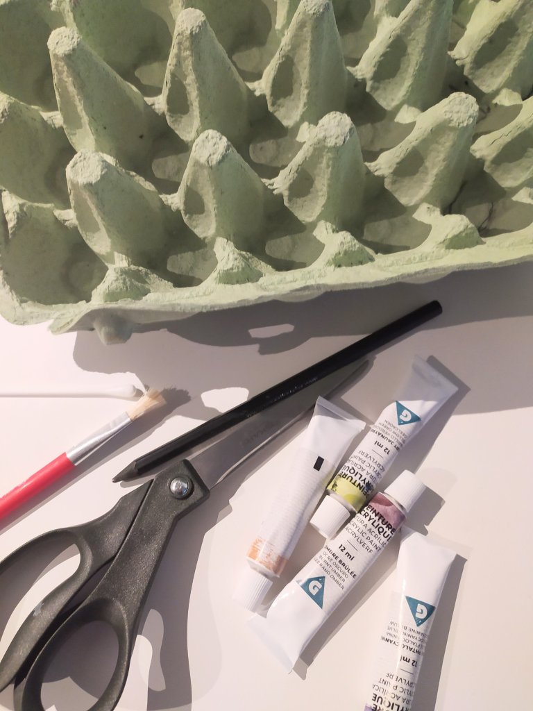 Matériel : boîte à oeufs, ciseaux, crayon, carton, peinture.