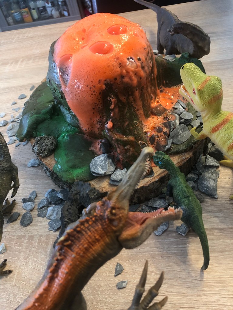 Faire sécher. Idéalement 12h à l’air libre puis au four à basse température. Environ 100 degrés. Nous avons voulu éviter le temps de séchage à l’air libre pour accélérer l’expérience. La pâte peut se déformer un peu et craqueler ce qui ne dérange pas pour la forme d’un volcan.