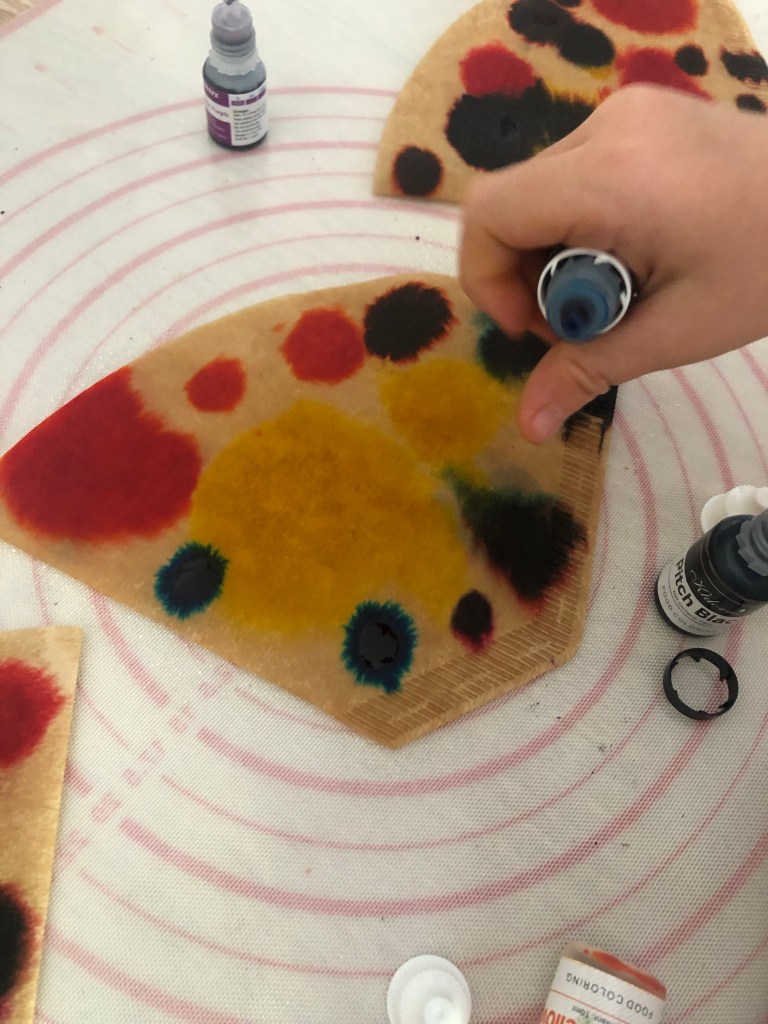 Déposez les gouttes de colorants alimentaire. Si vous avez de l’encre, vous pouvez la diluer dans de l’eau et déposer des gouttes sur un filtre sec.