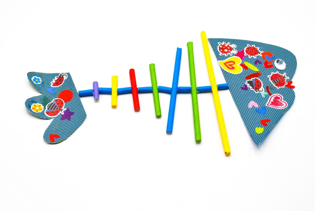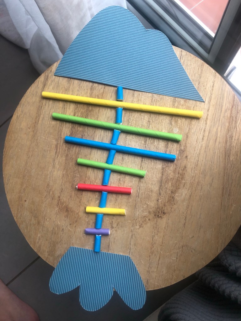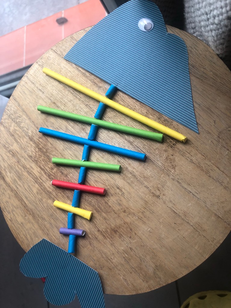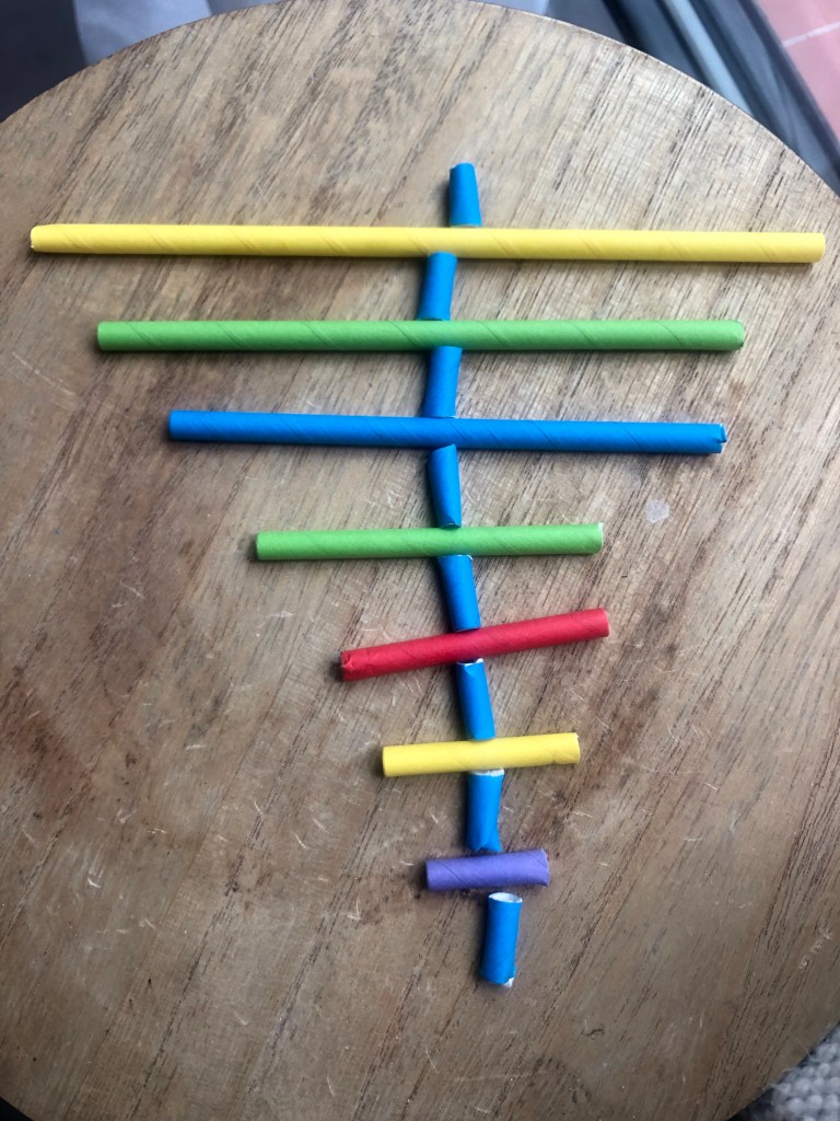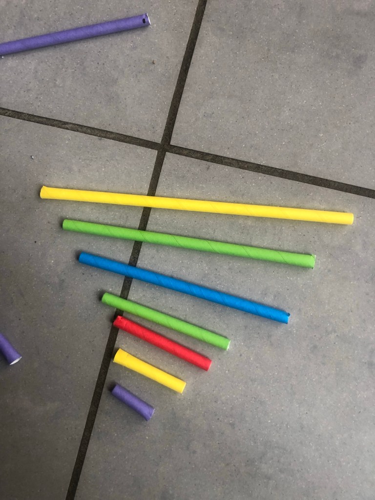 Commencez par tracer un petit trait sur chaque paille pour que votre enfant les découpe. Les plus grands n’auront pas besoin du trait. Il faut réaliser 7 pailles de longueur différentes.